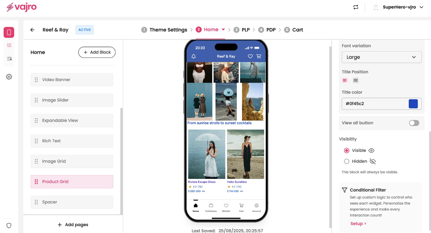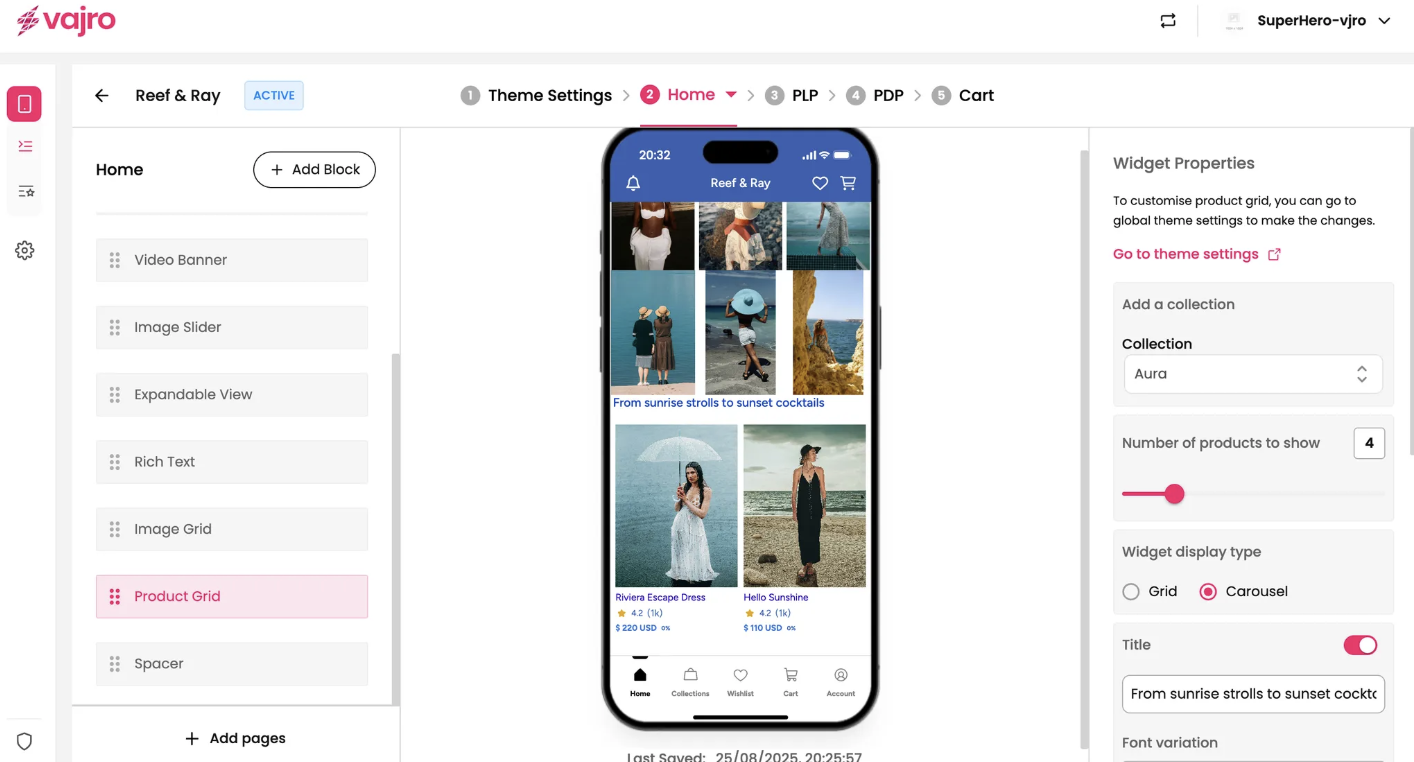 Display your best-selling or newly launched products in a beautifully organized grid or carousel format with the Product Grid block. This widget automatically pulls products from a collection you choose, making it a powerful and efficient way to drive sales and product discovery from any app page.