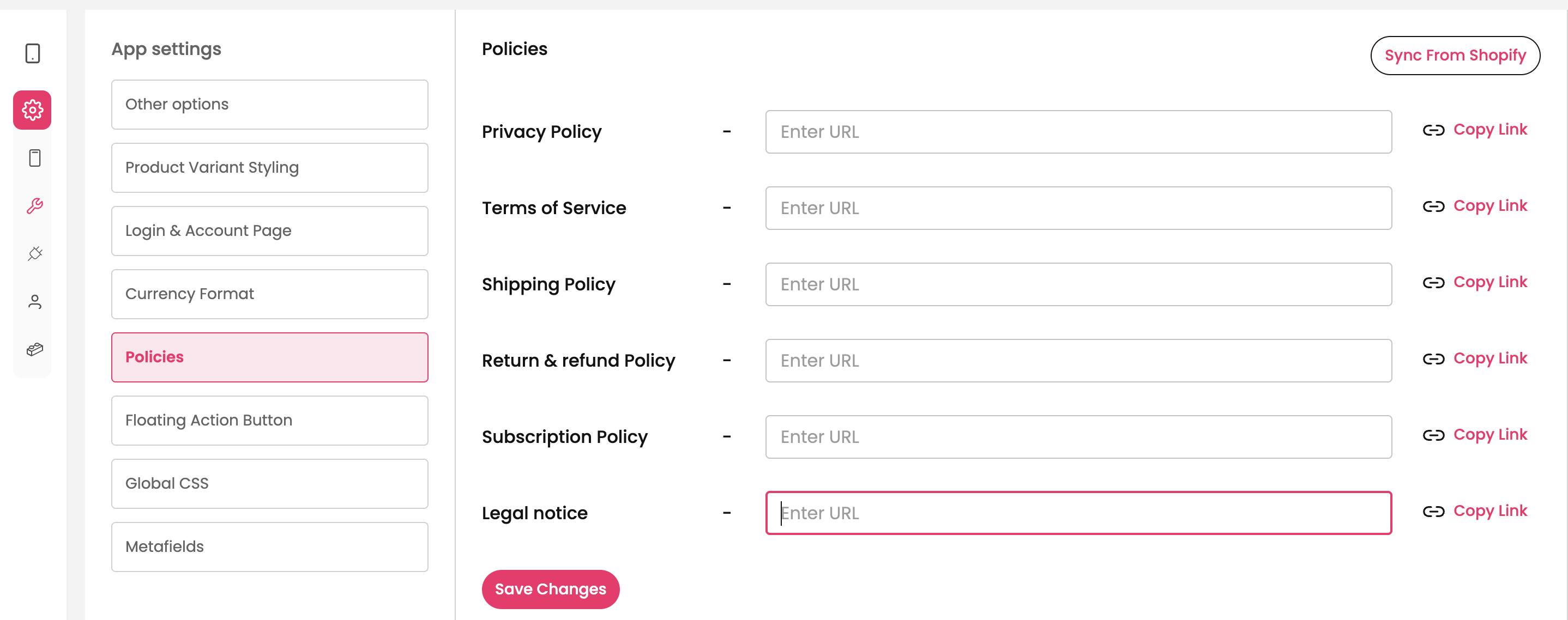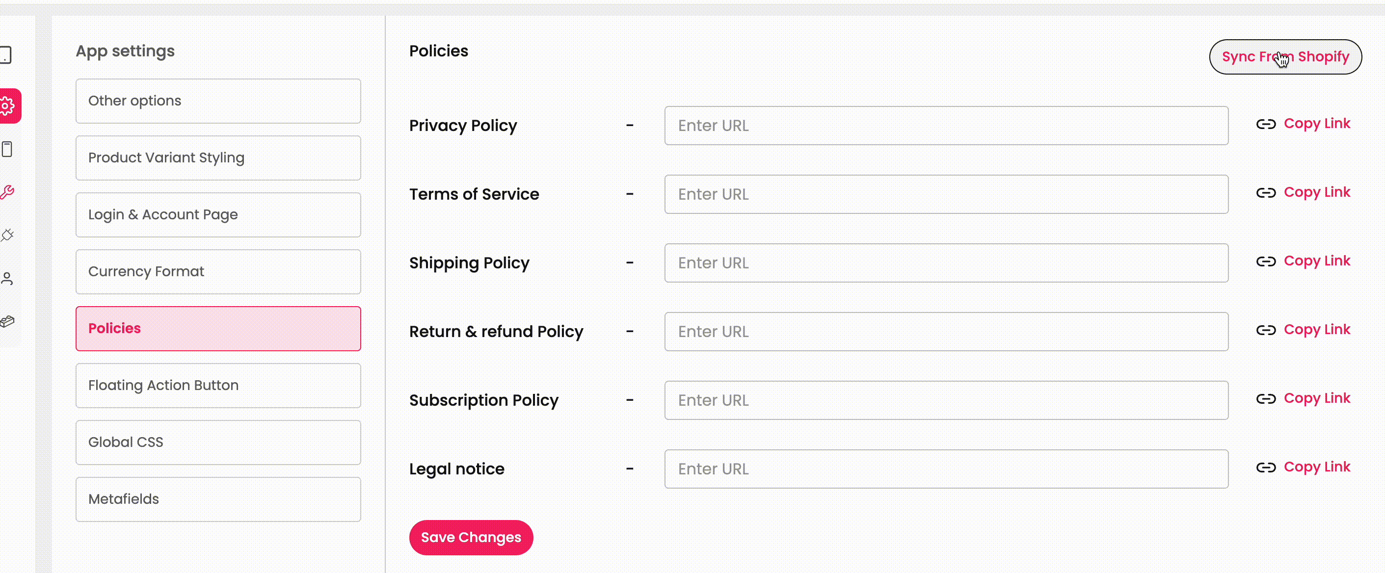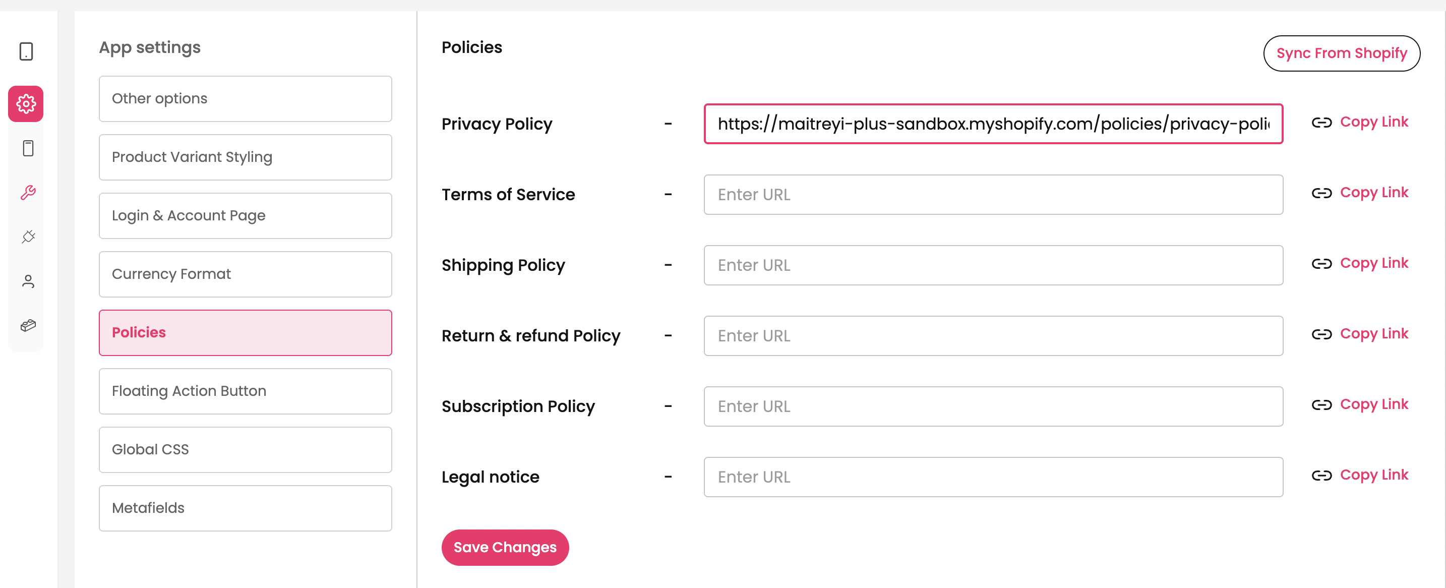 Click on Sync from Shopify CTA. This will auto-fill the policy links that are available in the website and Save changes.