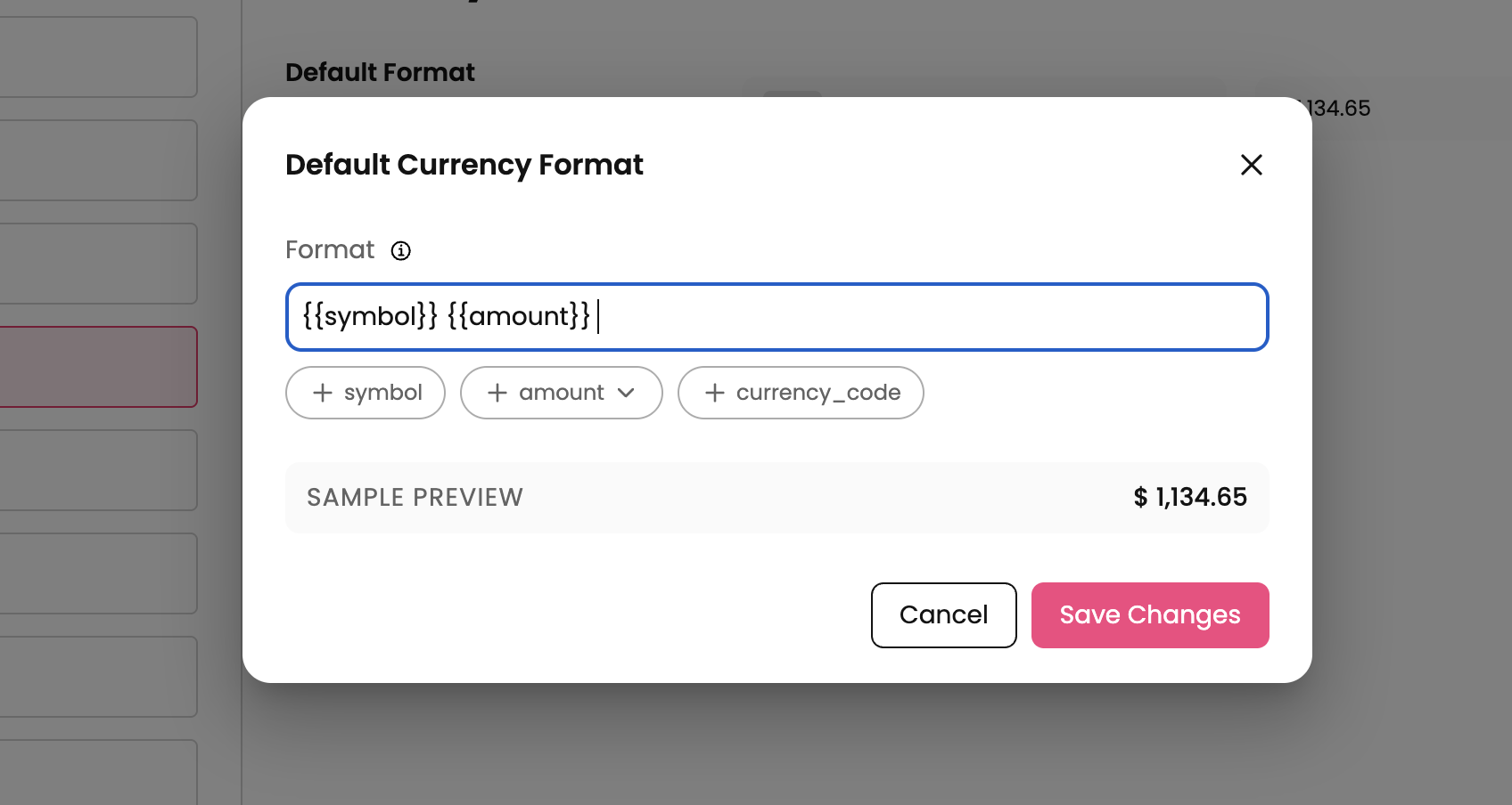 Step 3 : Choose the format you prefer by clicking on ”+” of the below options and click save changes. For eg., If you want the currency as $123.44, below is the options you need to choose.