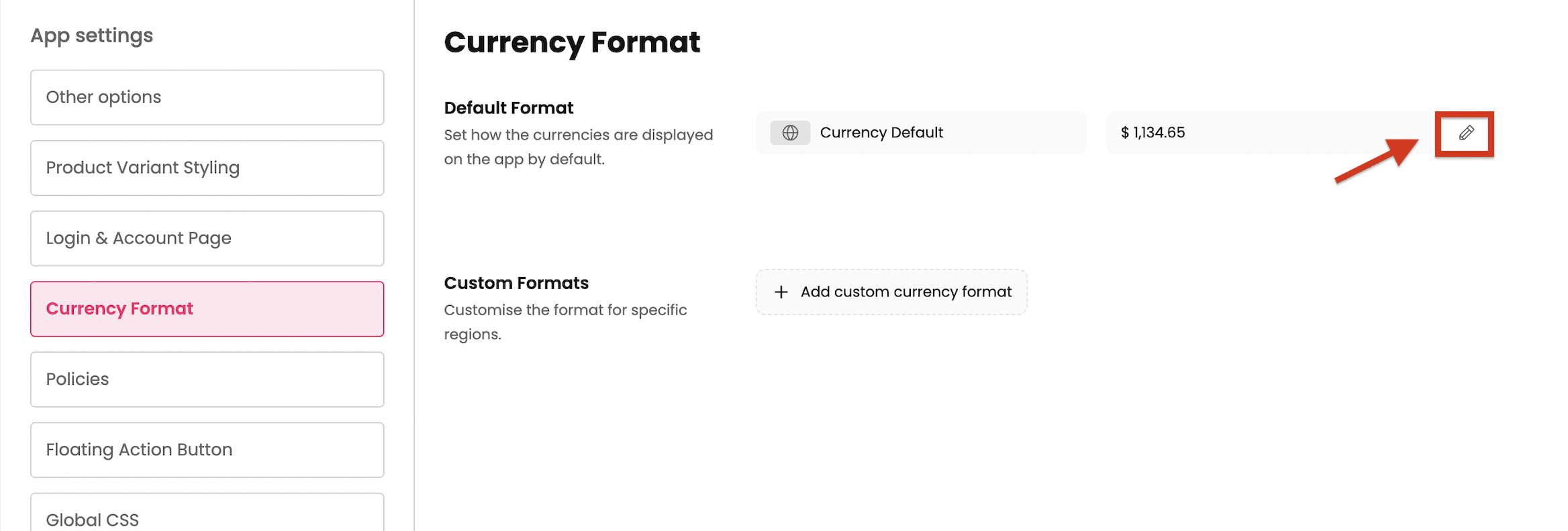 Step 2 : Click on the Pencil icon to change or modify the format of the default currency.