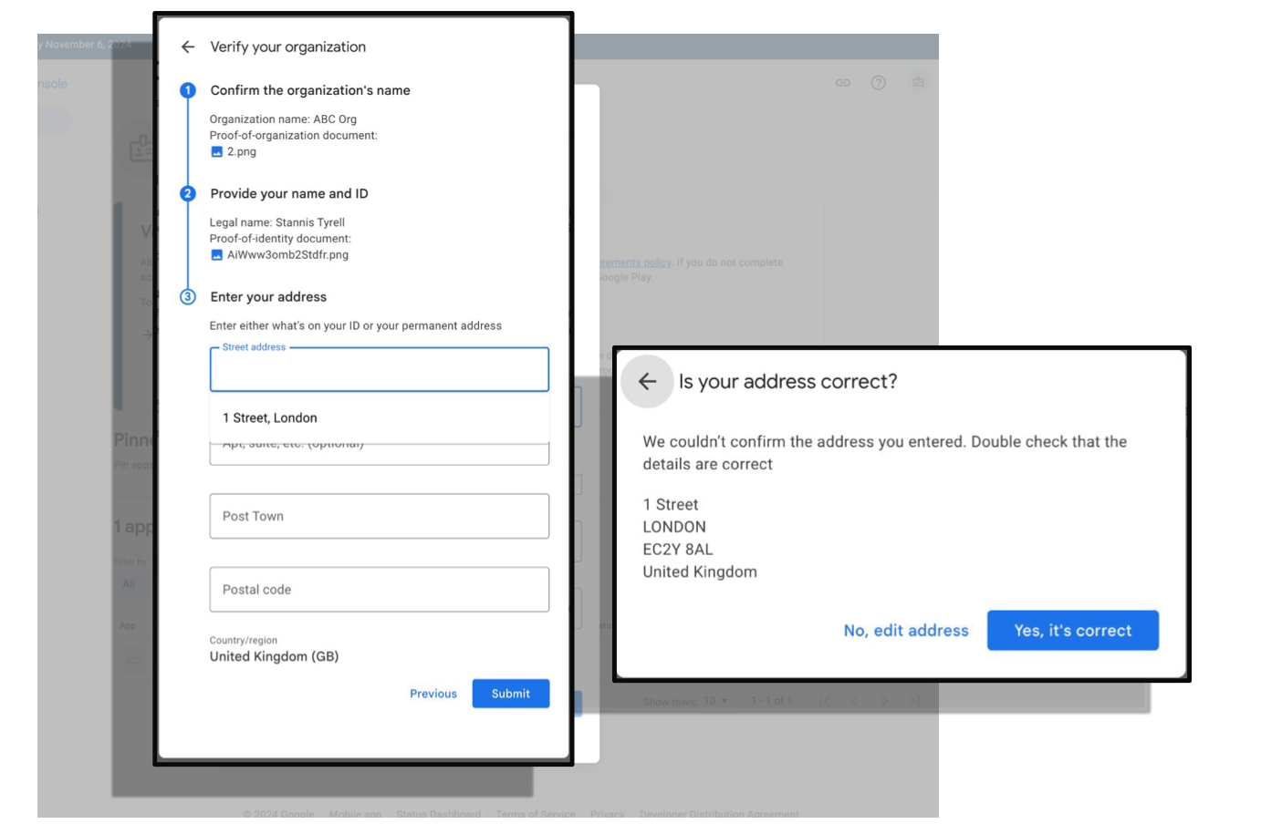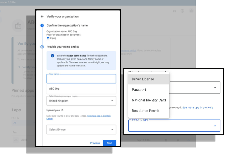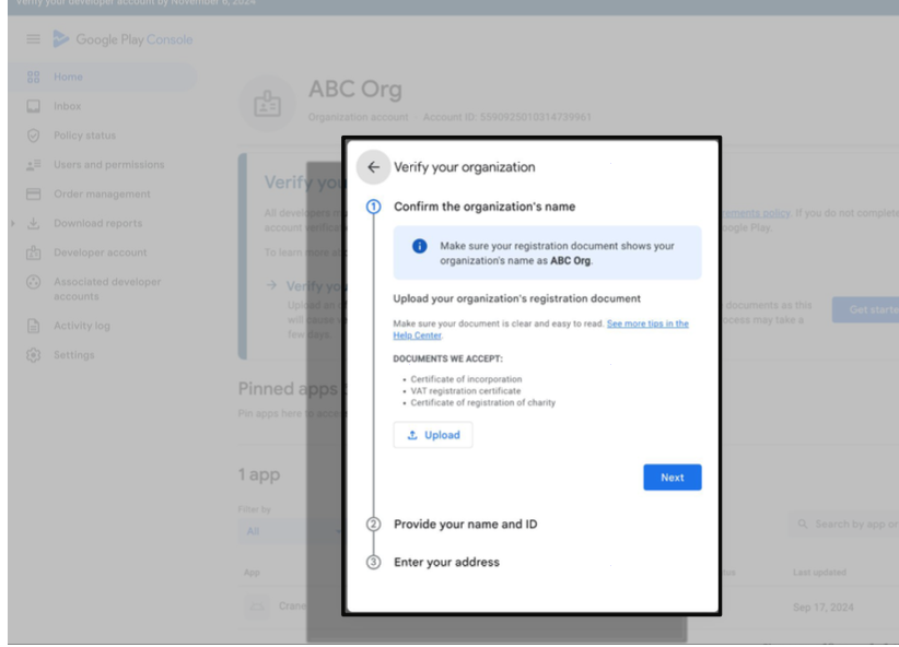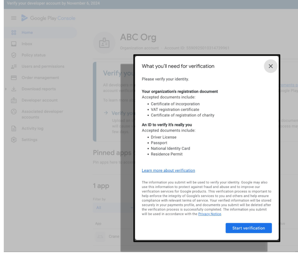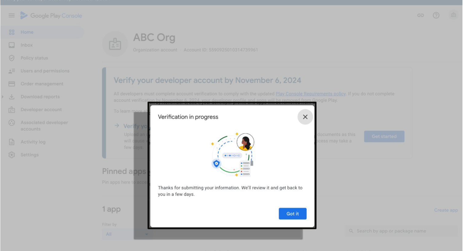 This process helps protect users, ensures compliance with Google Play policies, and enables the organization to access app management, monetization, and support features safely. Verification usually takes a few business days after submission of the required documents.