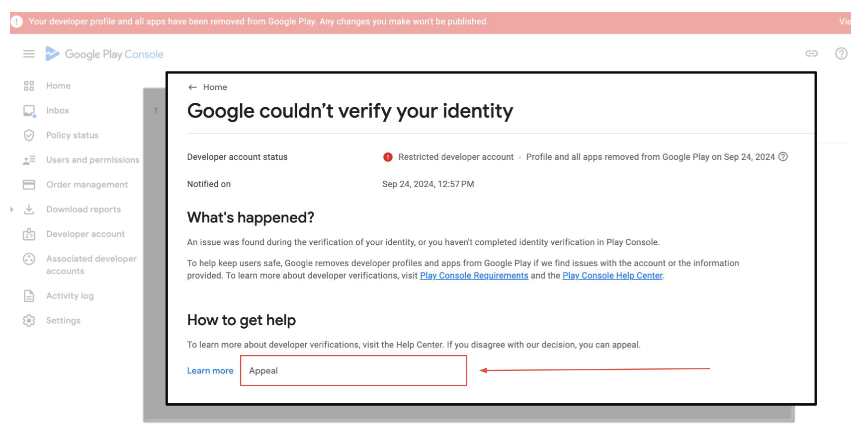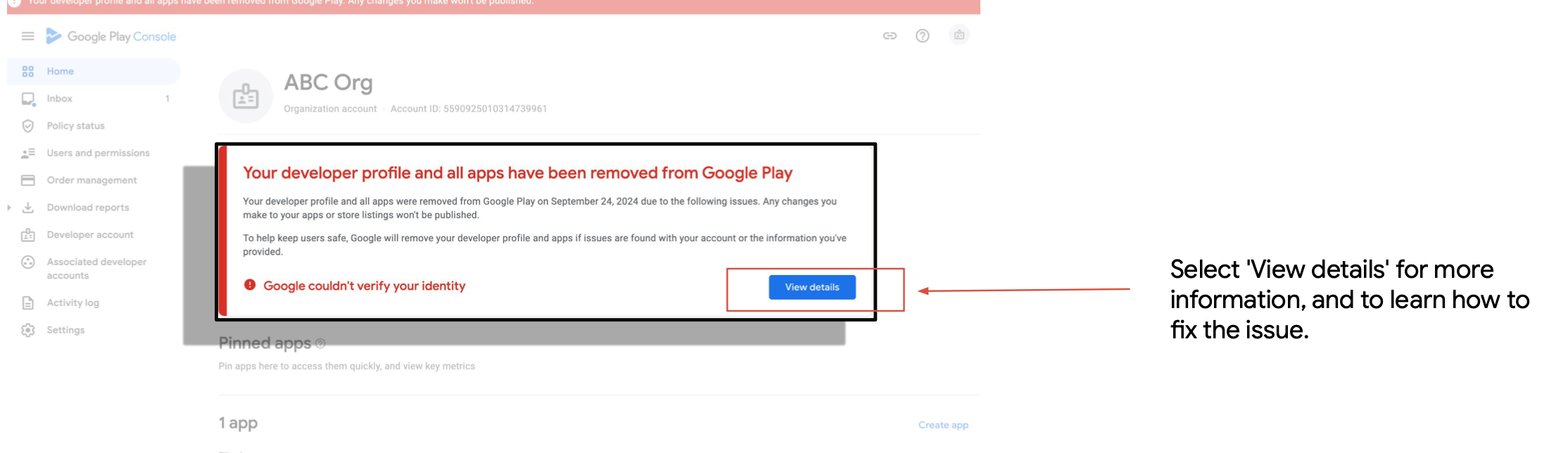 Your Play Console homepage will display a message explaining why we couldn’t verify your account. The account owner will also receive emails with more details.