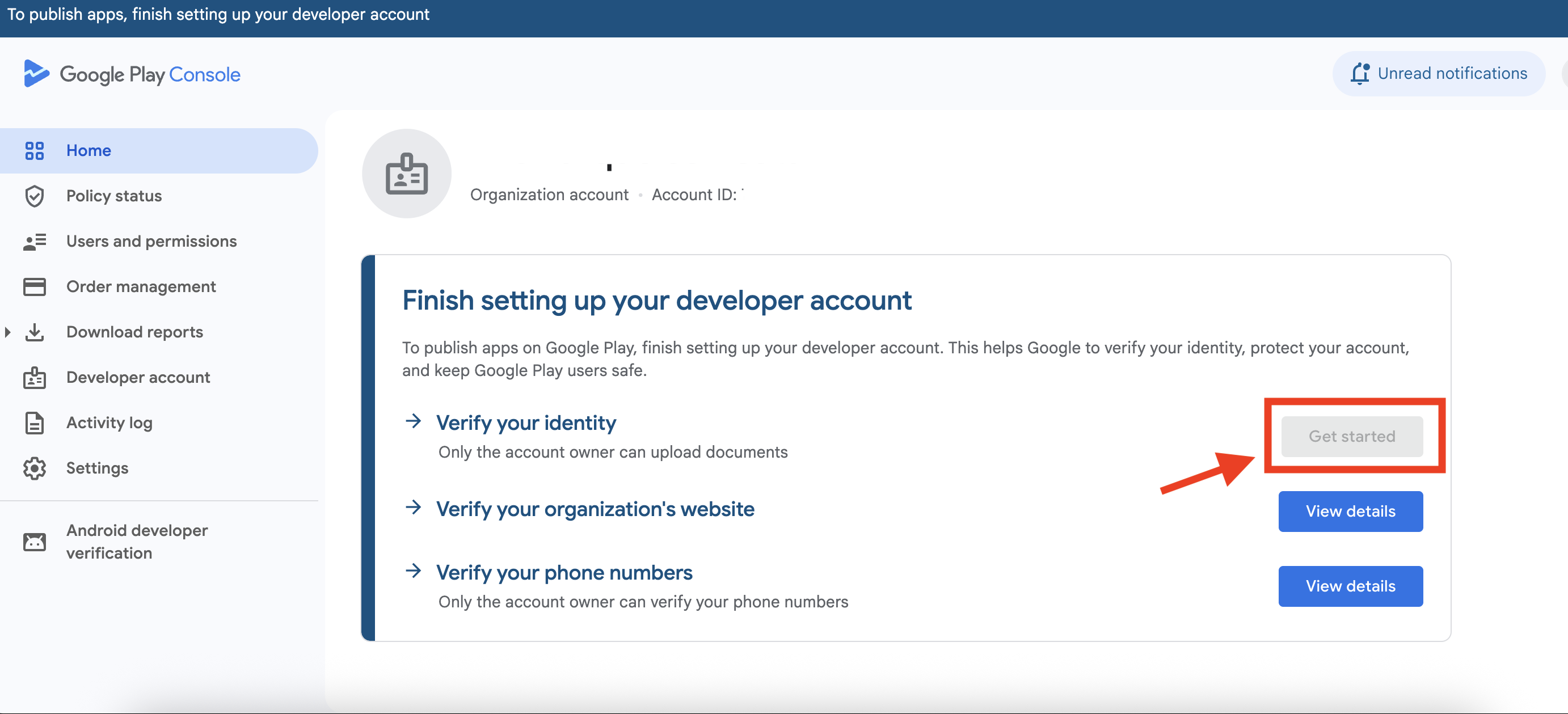 Step 1 : Go to google Play console and on the Home Page, click the “Get Started” button right to “Verify your identity”.
