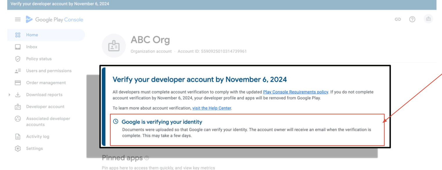 Your Play Console homepage will display a message explaining that Google is verifying your identity. This may take a few days.