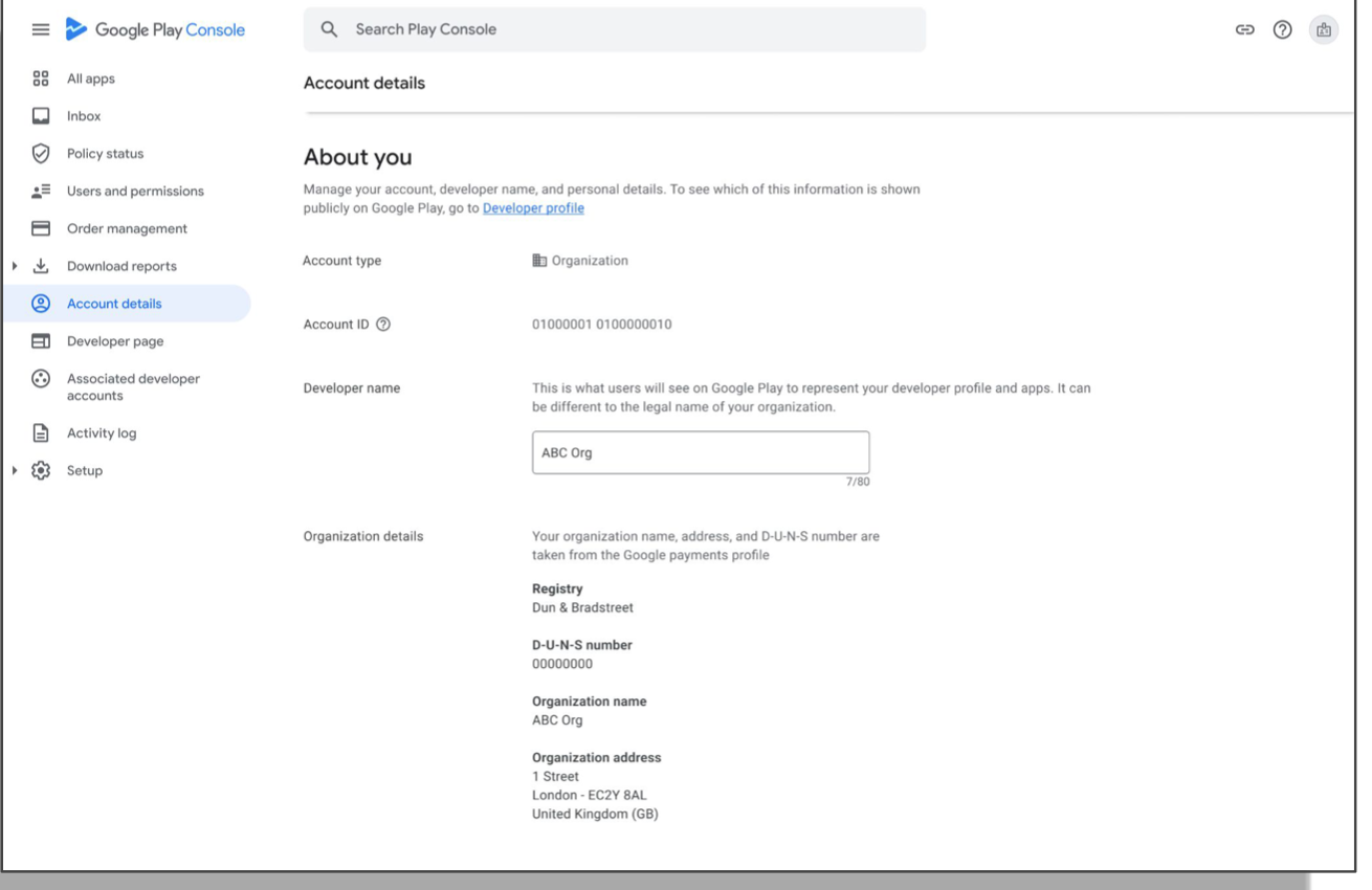 When your organization has been successfully verified, verification banners and messages will disappear from Play Console. You can view your verified information on the Account details page.