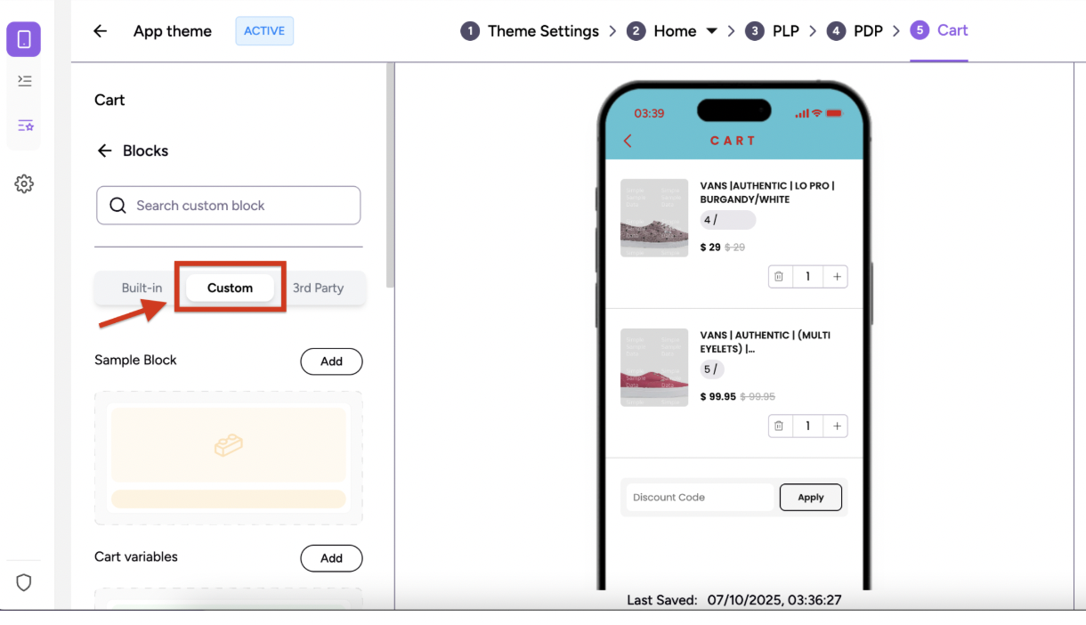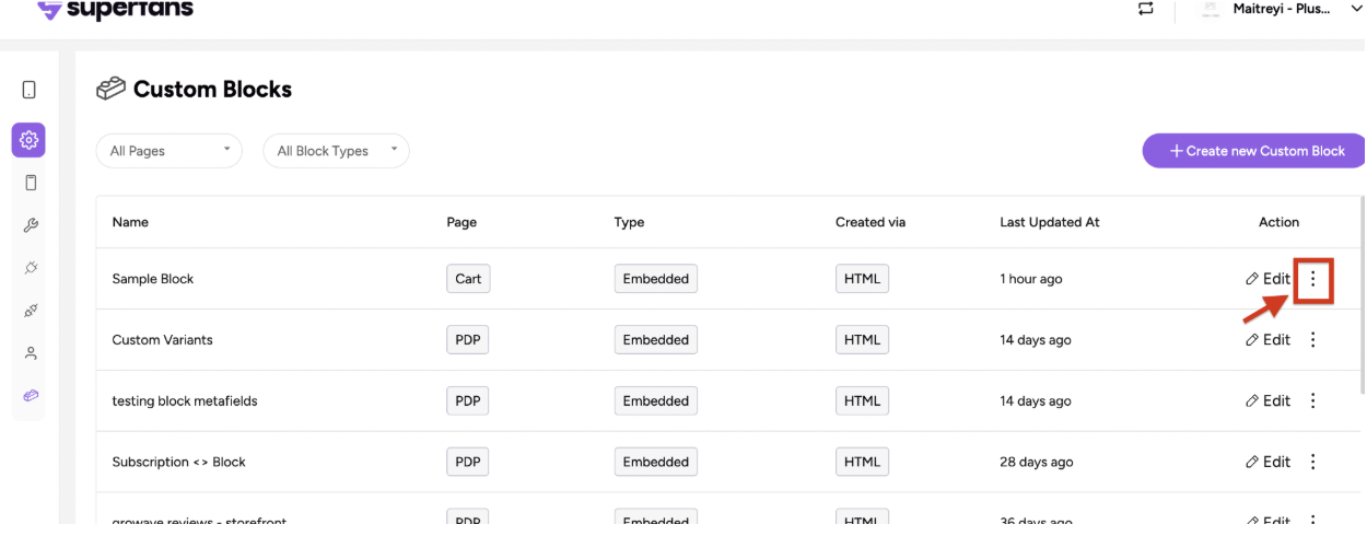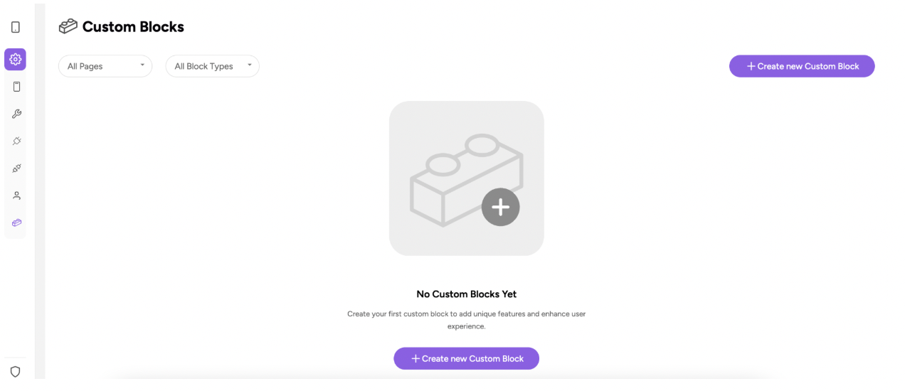 Navigate to Custom Blocks section of the dashboard from the Settings menu on the side bar