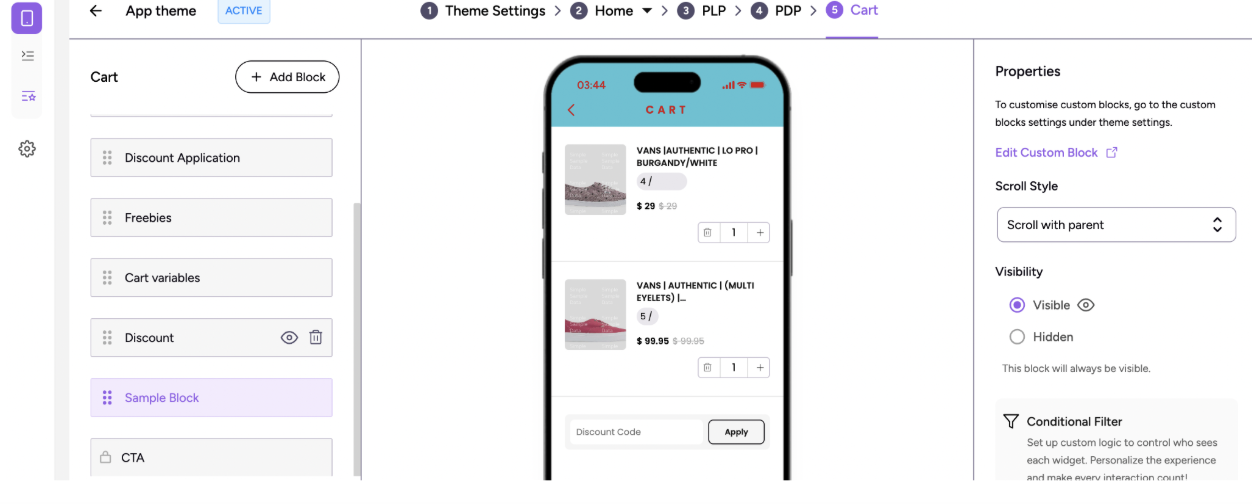 Based on the block you created, add the block to the respective page for it to appear on the app.