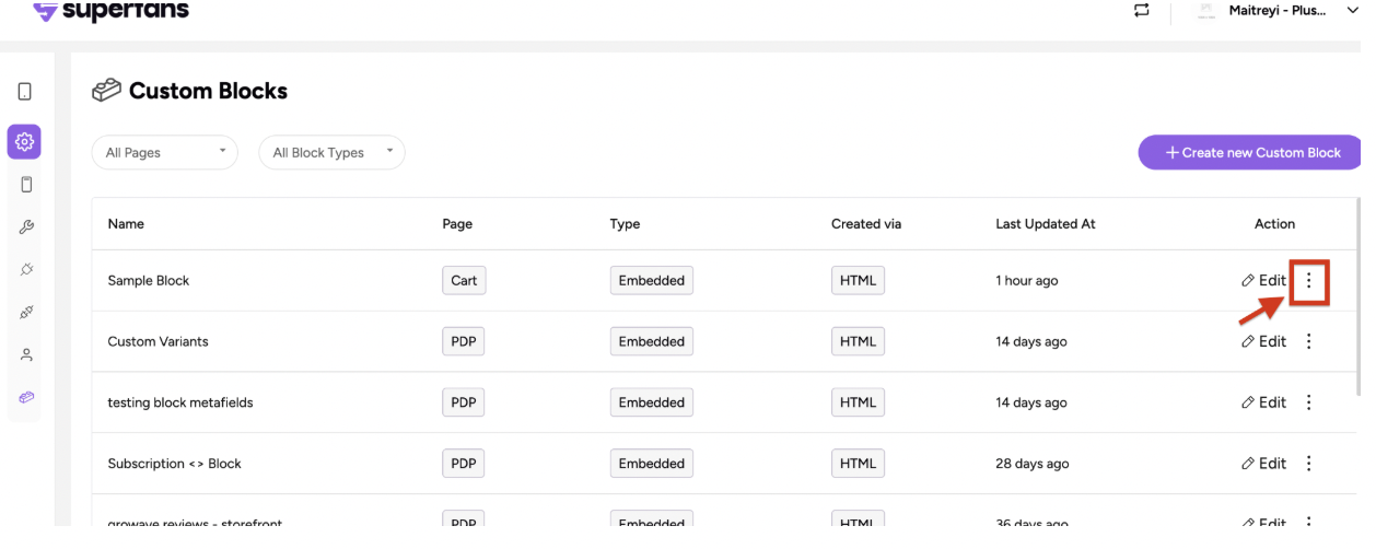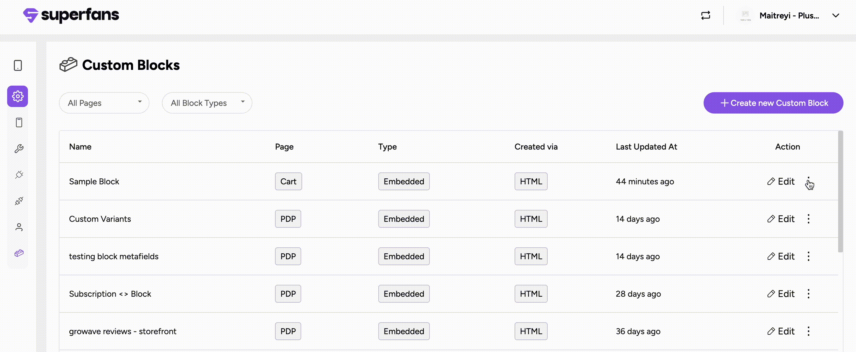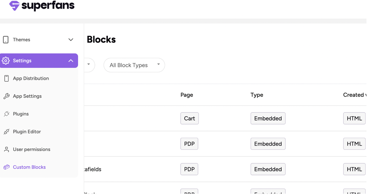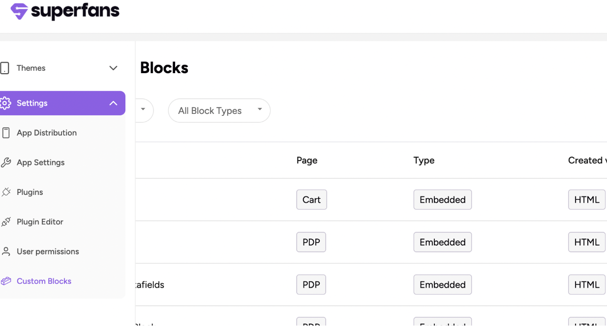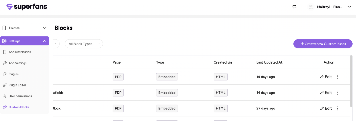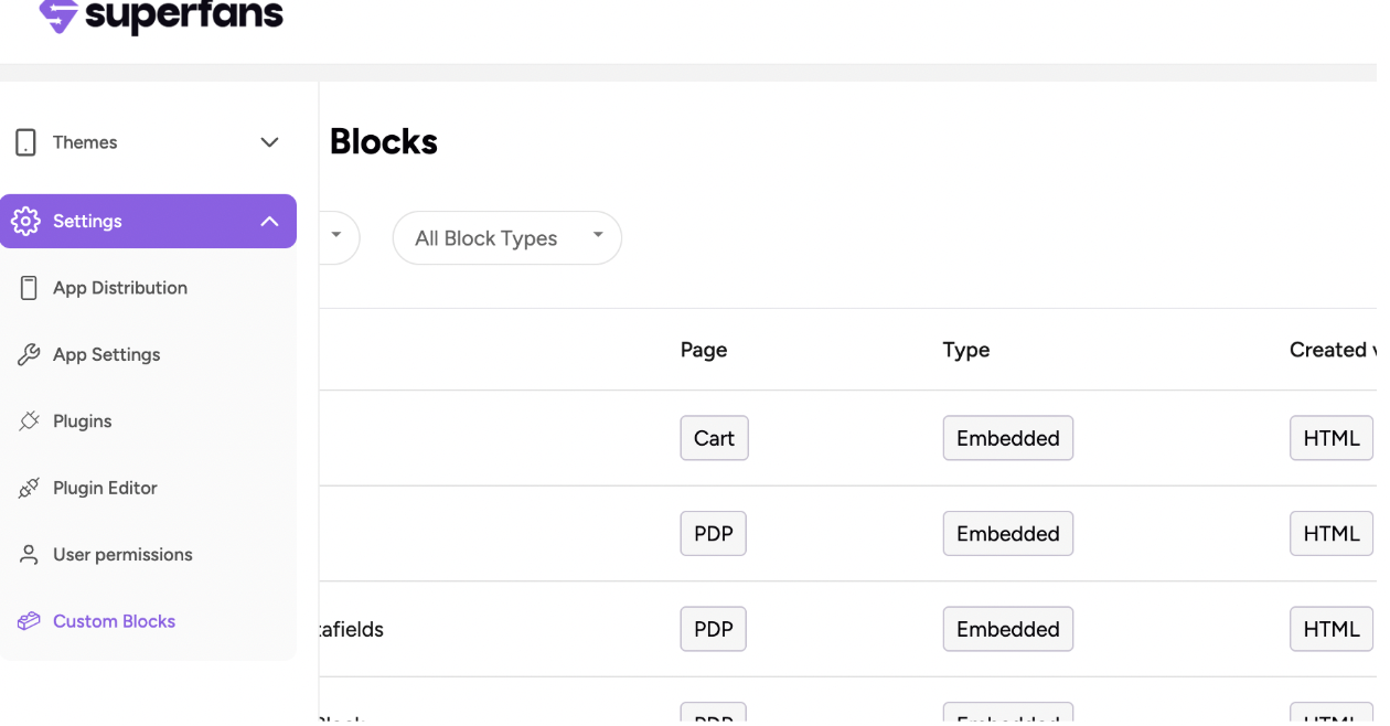 Superfans allows you to edit, duplicate, and delete custom blocks, giving you complete control over your app layout. These operations help you iterate quickly, maintain reusable blocks, and clean up unused content.