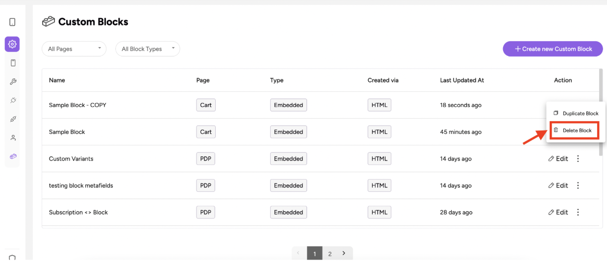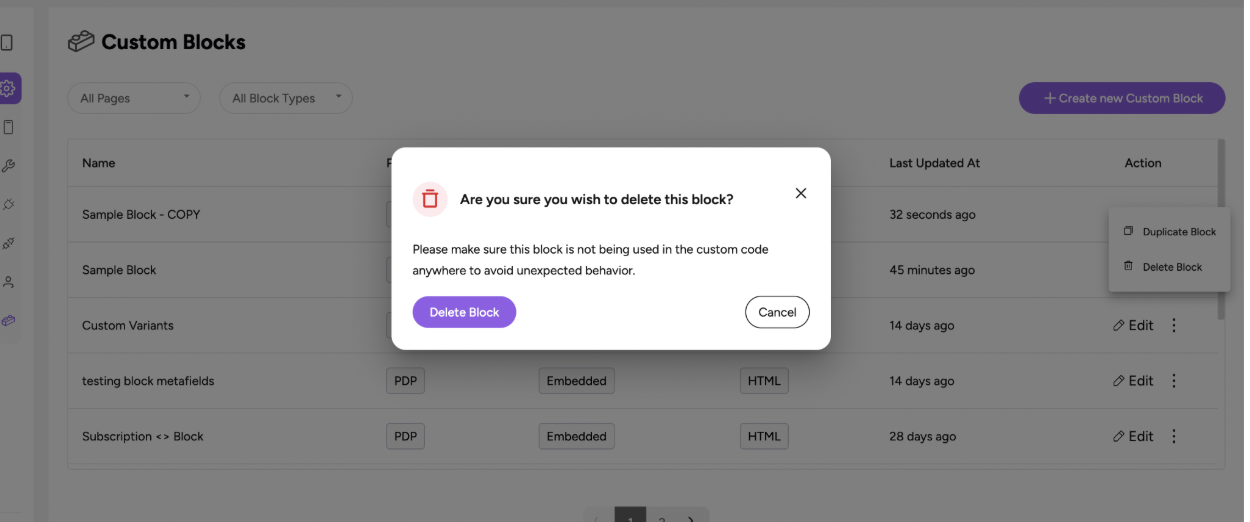 Deleting a block permanently removes it from your app. Use this when a block is no longer needed or outdated.