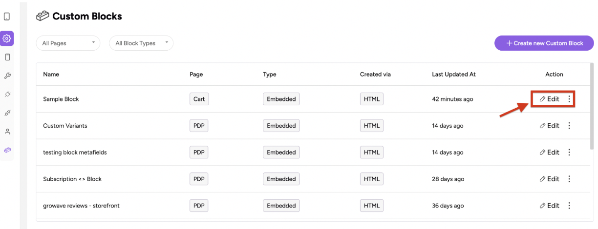 Editing a block lets you modify the HTML, CSS, JS, or configuration of an existing block.