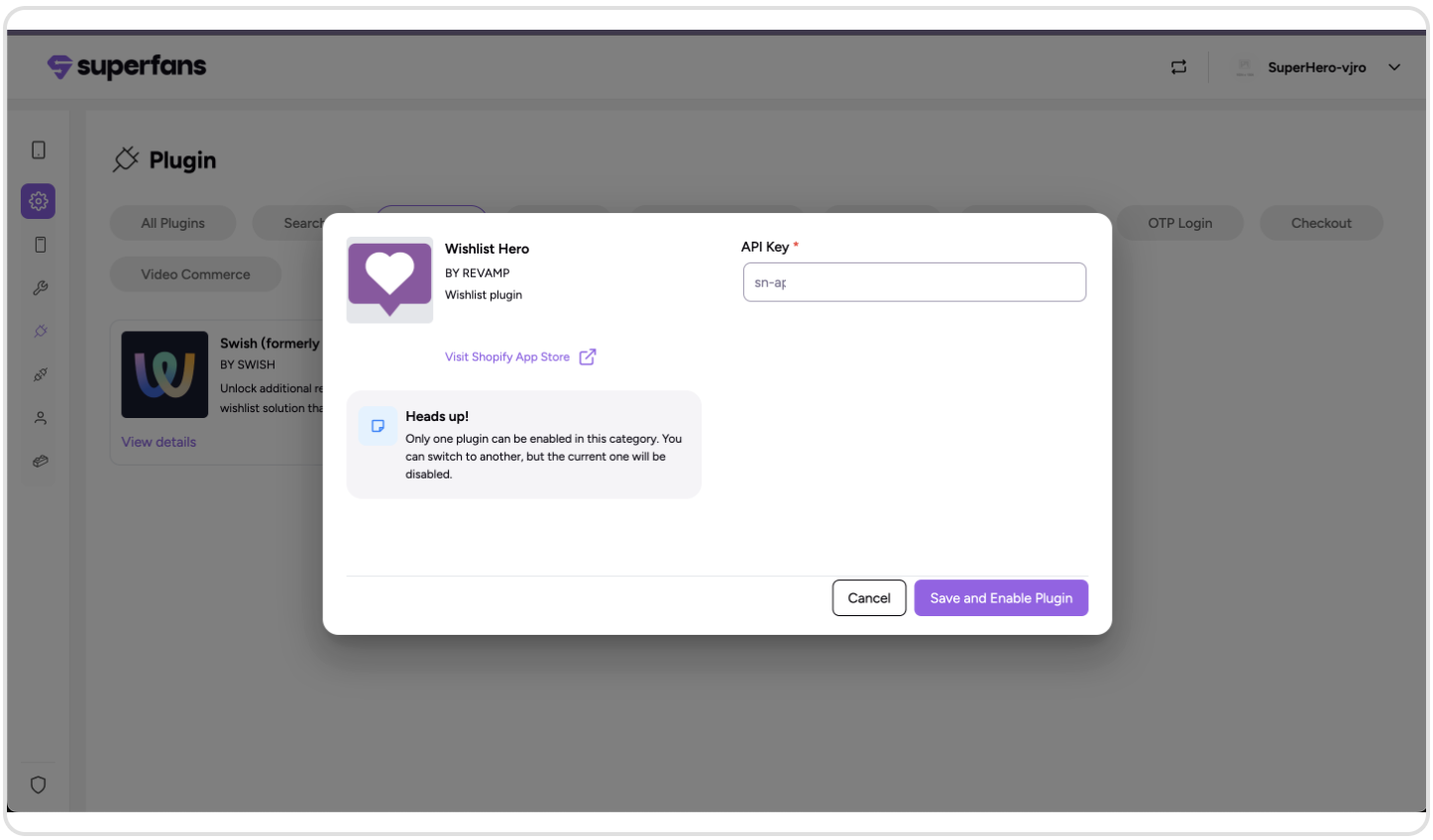 Step 1 : Log in to your Superfans dashboard and go to Settings > Plugins.