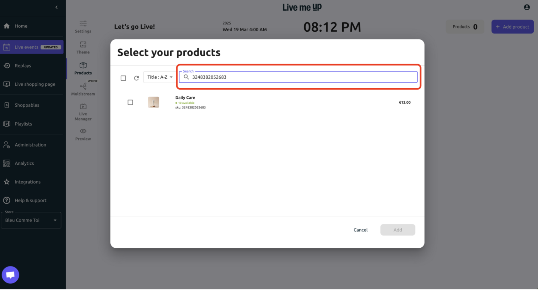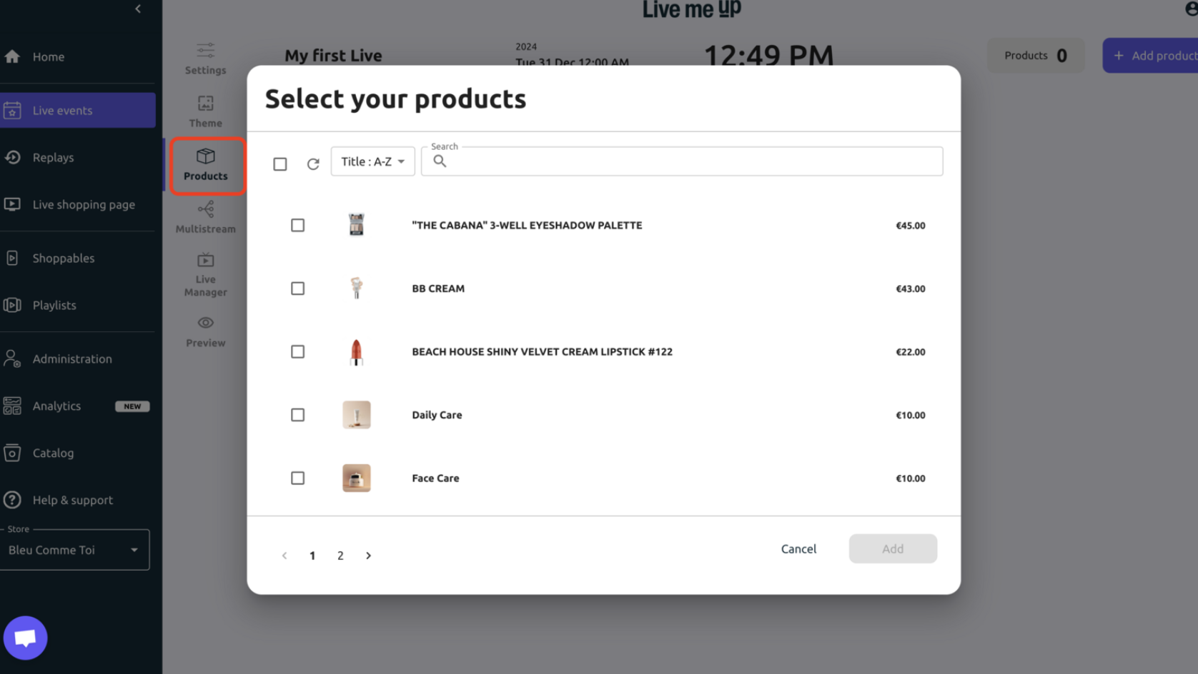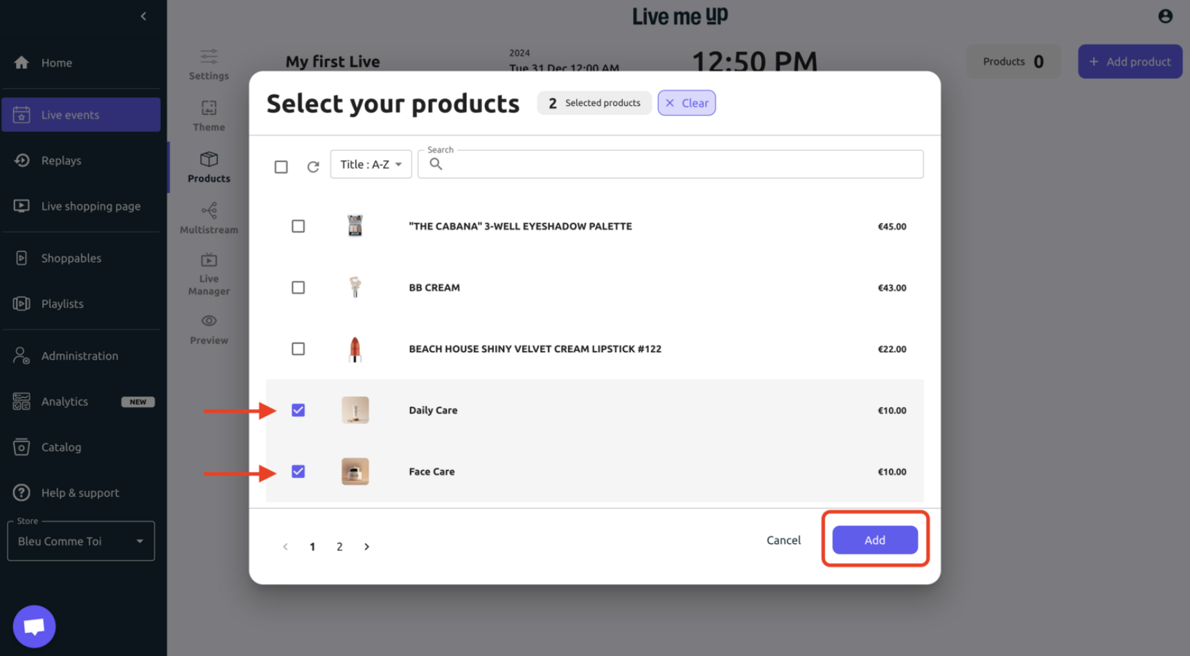 Select the products you want to add to your Live event and confirm with "ADD".