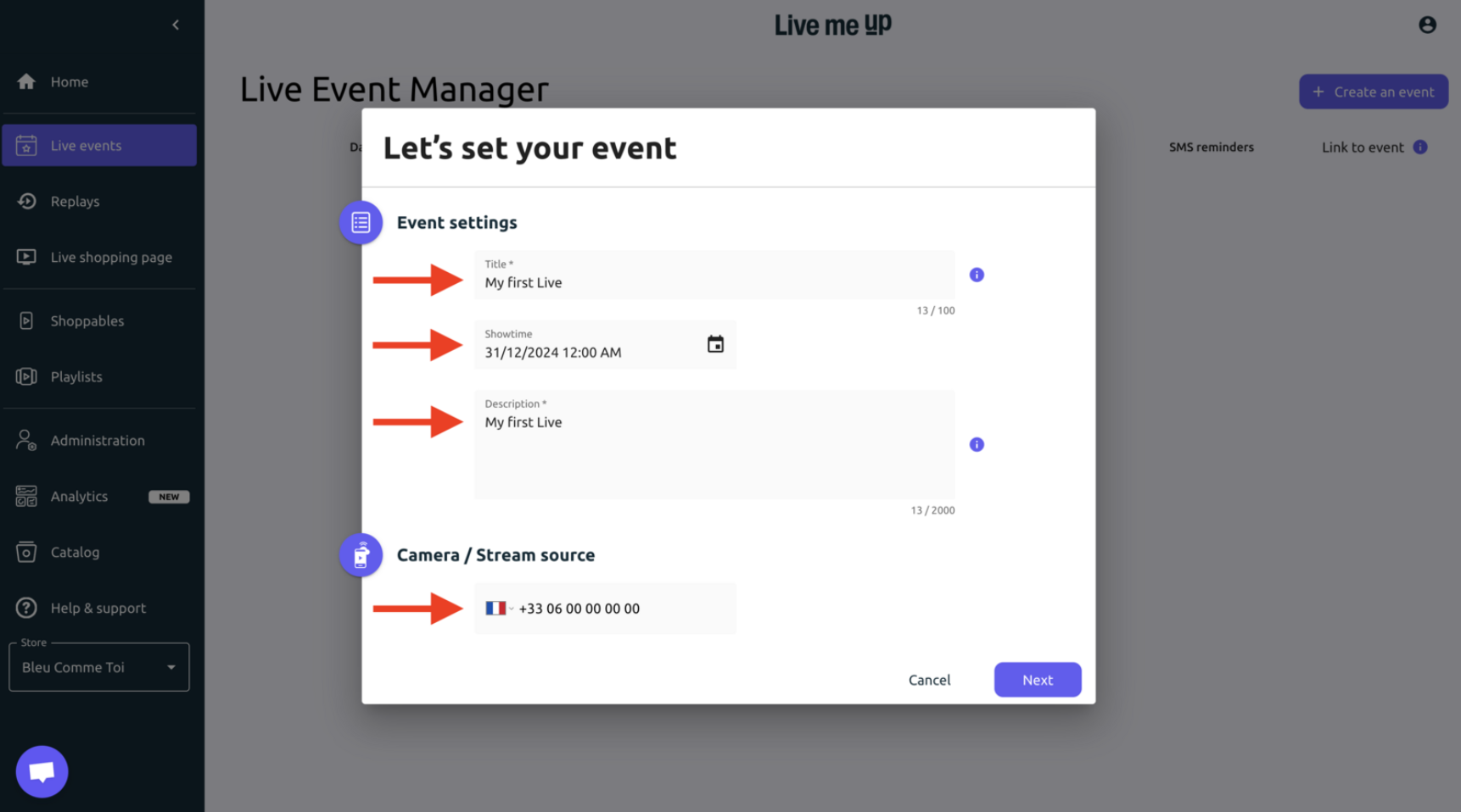 Step 2: Add a title, a showtime, a description and the smartphone number as your primary streaming source.
