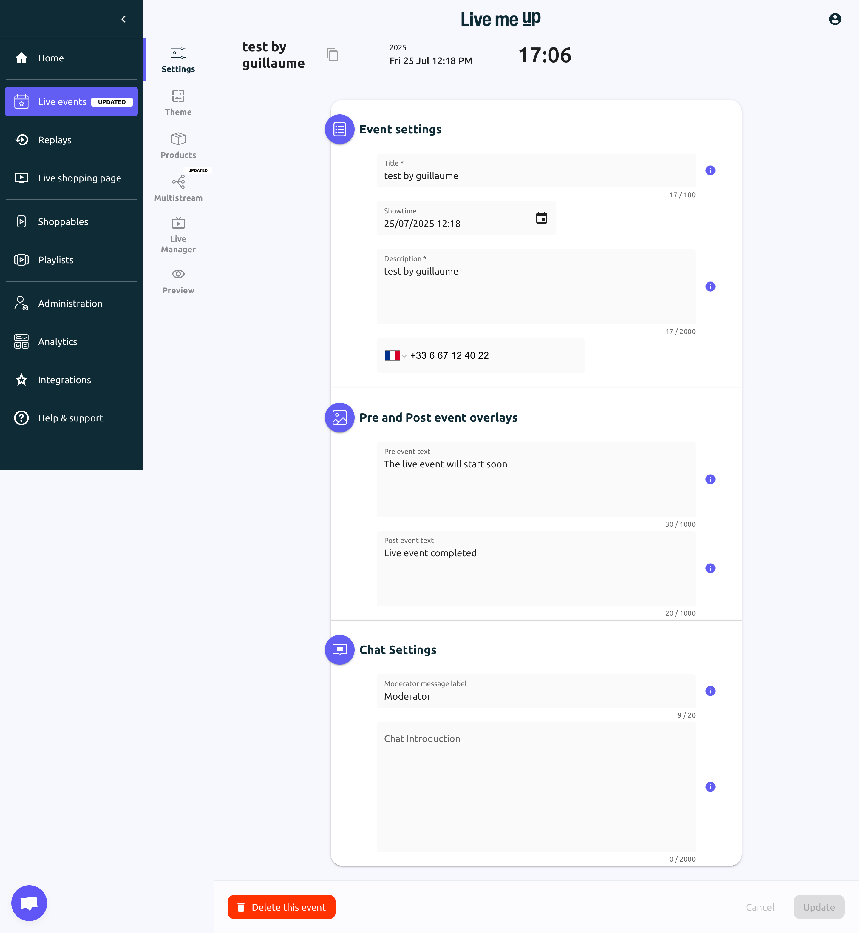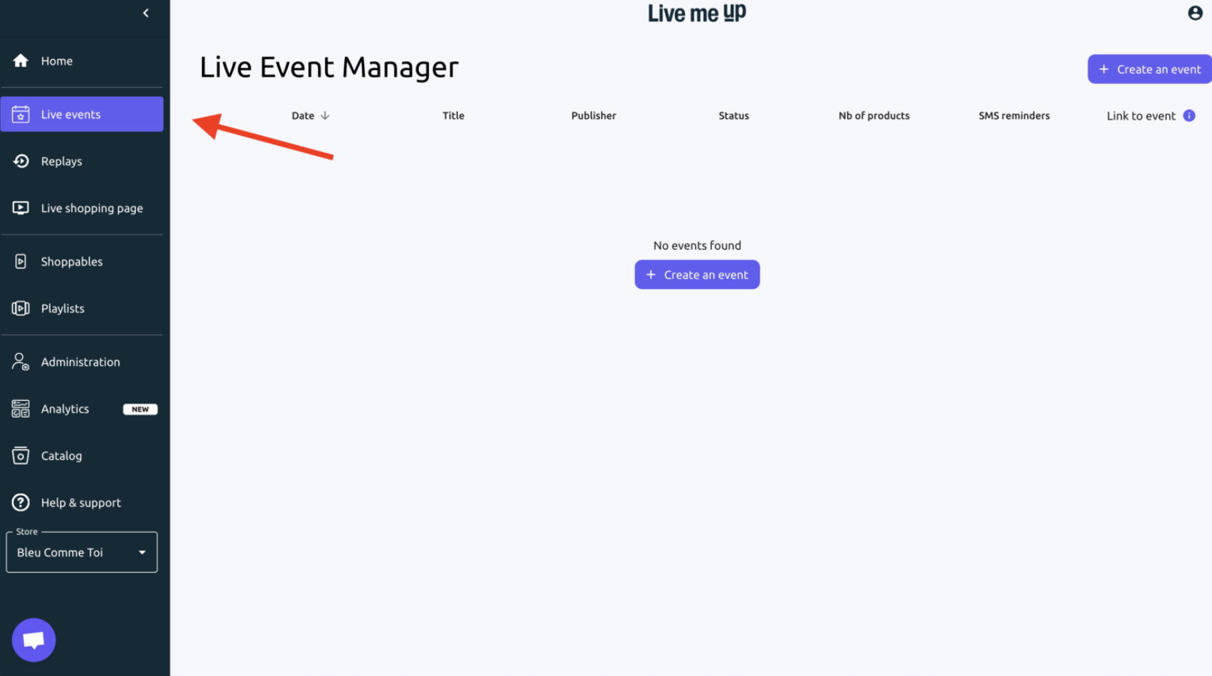 Step 1: In the Liveme Up Dashboard, go to the "Live Events" section on the left menu and click the "+ Create an event"