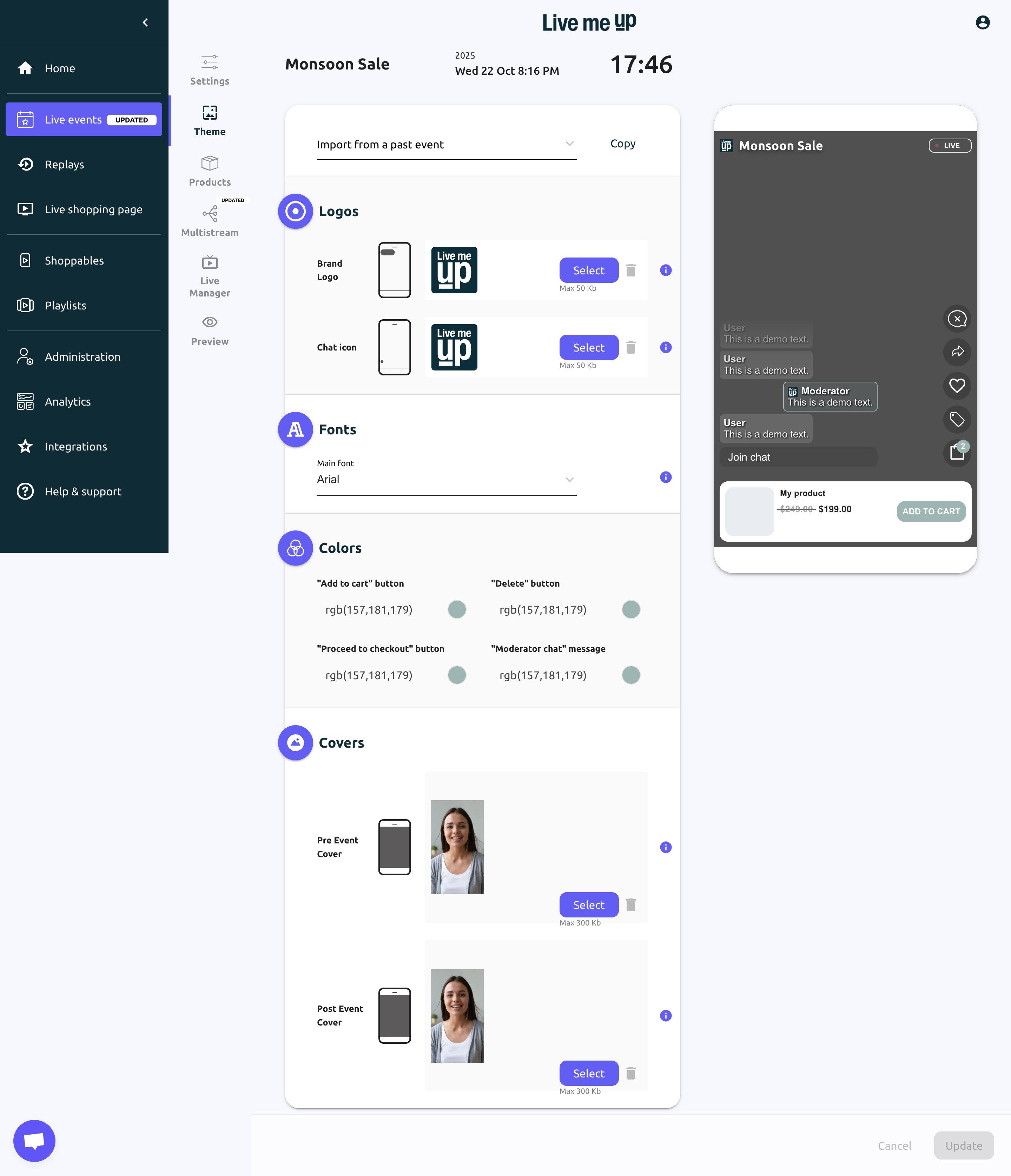 Colors: Set colors for “Add to cart,” “Delete,” “Proceed to checkout” buttons, and moderator chat messages (use RGB values).