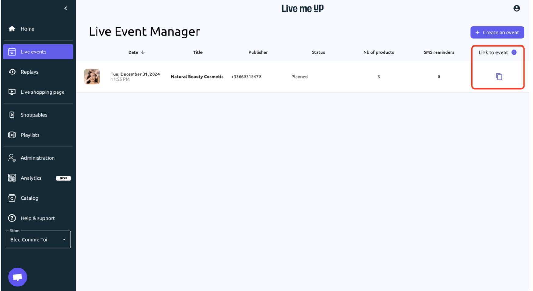 To copy the live event link, simply locate the desired event in the "Live Event Manager" click the copy icon in the Link to Event column. Share the copied link instantly via email, SMS, newsletter, or your smartphone’s social apps.