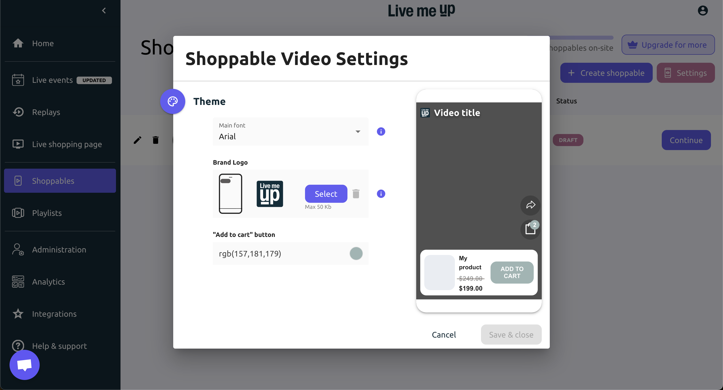 Go to Shoppables from the main menu, select a video, and click the Settings icon to open the customization pop-up.