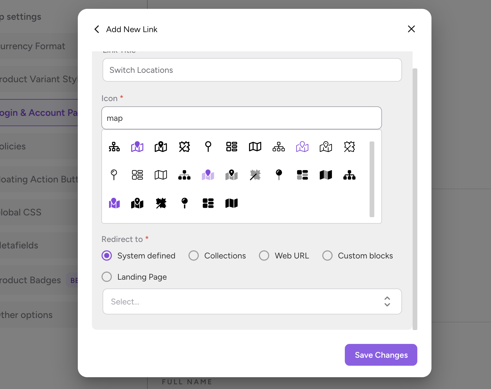 Step 4: Provide the name, select suitable icon, set the “Redirect to” property as System Defined.
