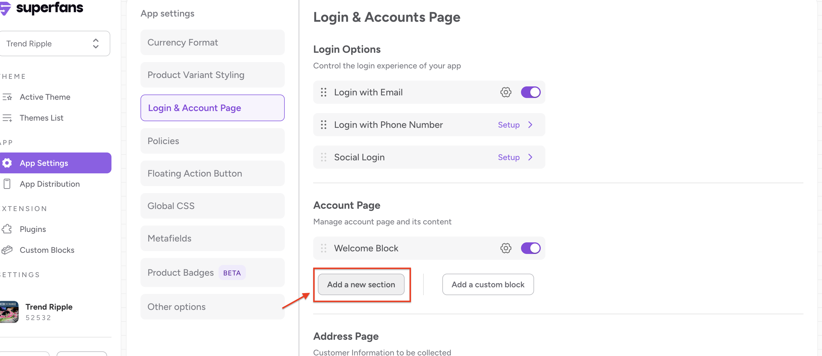 Step 1: Navigate to Login and Account Page on Superfans dashboard by navigating to App Settings menu from the side bar.