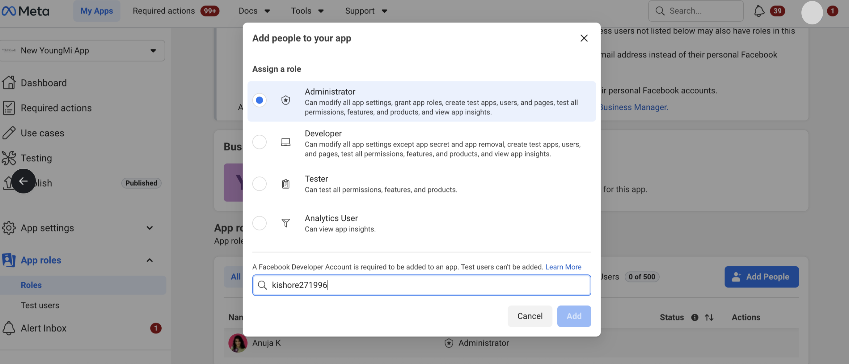 Step 3: Assign Administrator as the role, and enter kishore271996 as the Facebook Developer account to be added to the app. Once youโre done, click Add.