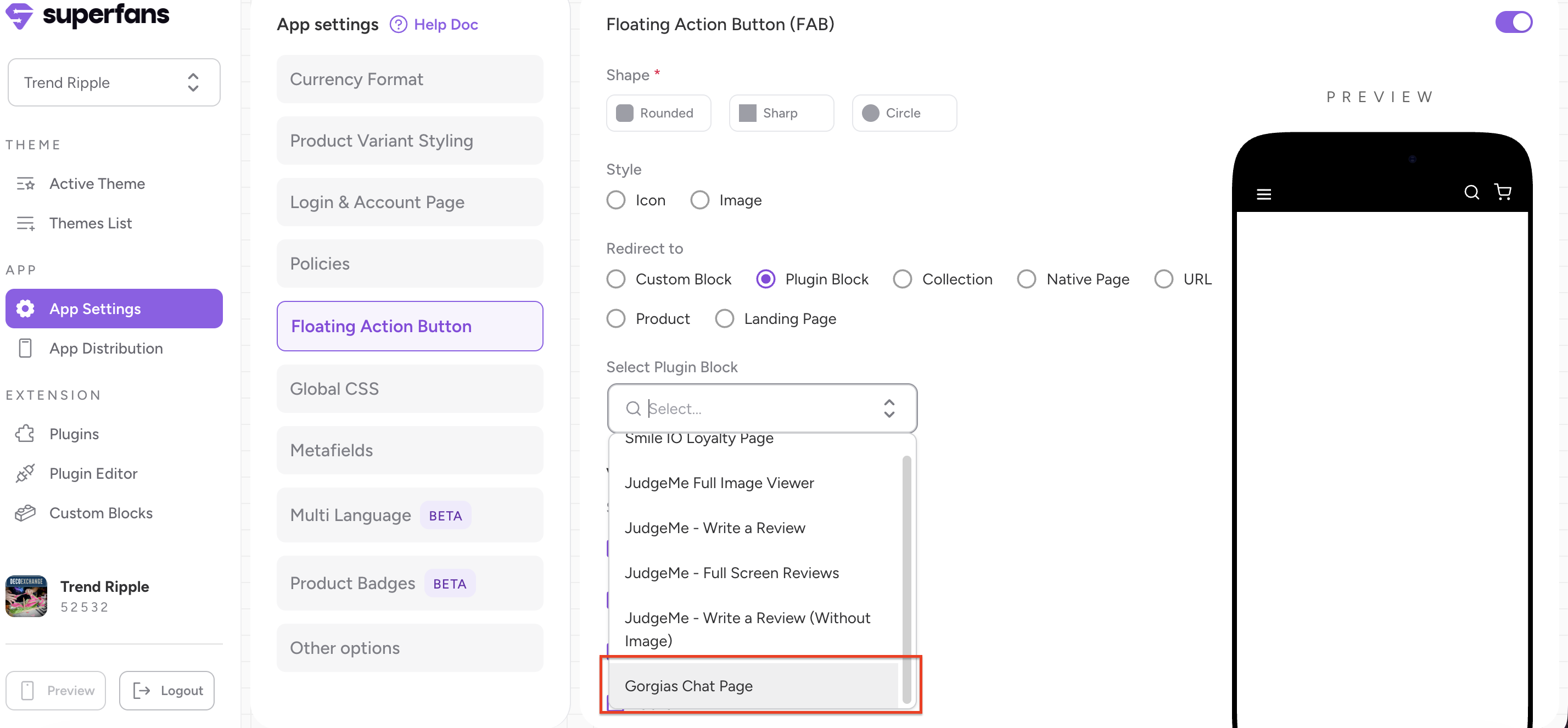 To place the block on the Gorgias chat block on "Floating Action Button”, do follow the steps below: