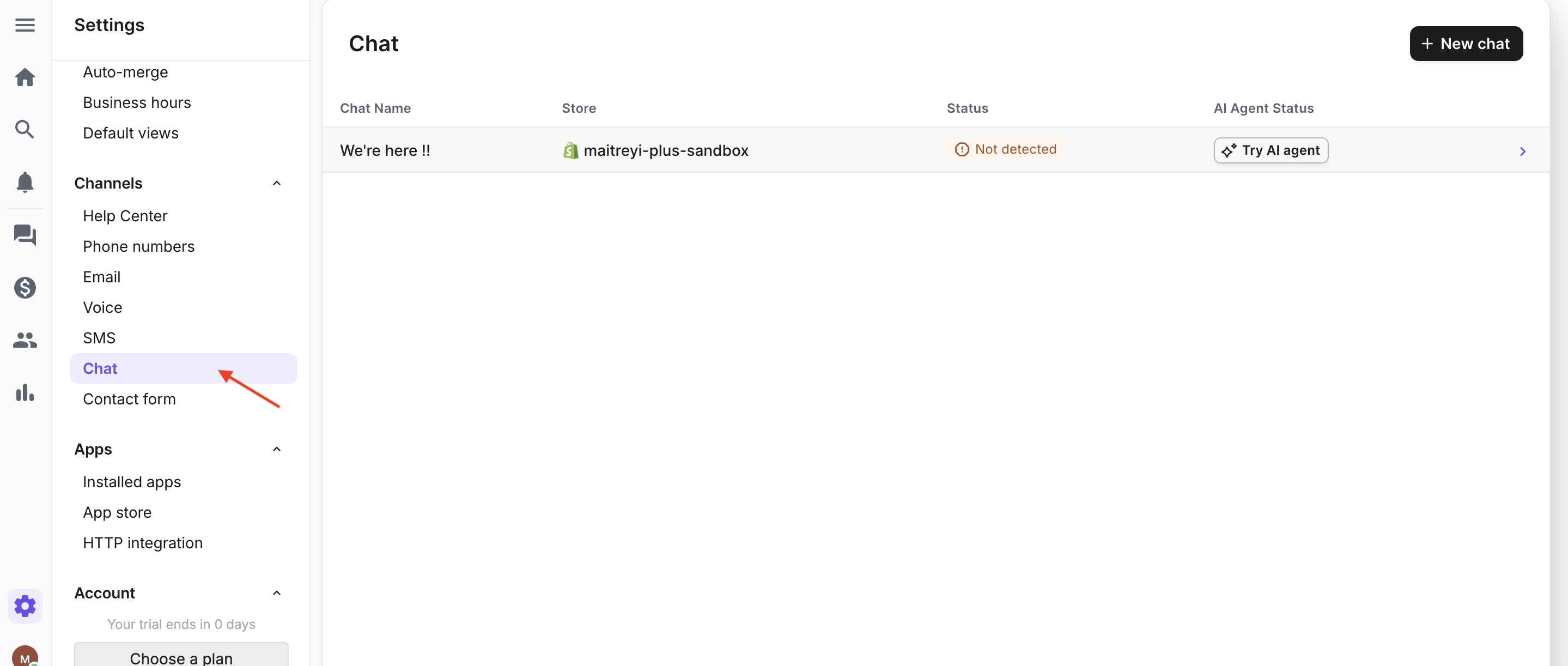 Step 4 : Navigate to the channels and select “chat“ from the list. You’ll find the chat enabled on the website. Click on the chat.