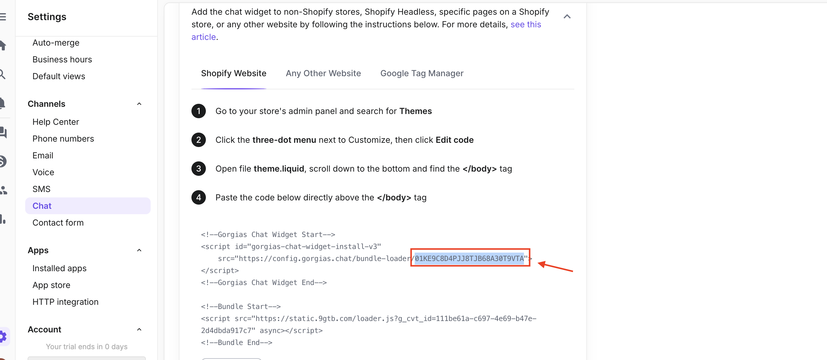 Step 6 : Scroll down and you’ll find the the installtion method as “Shopify Website”. Copy the Bundle ID from the from the code as highlighted below.