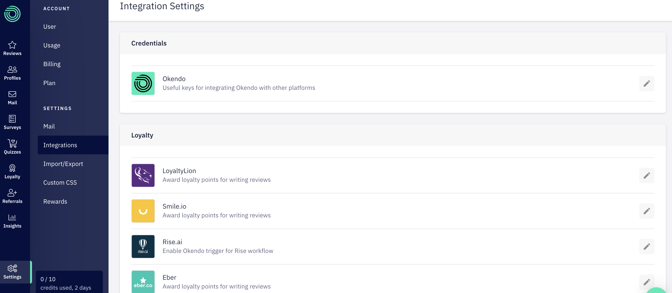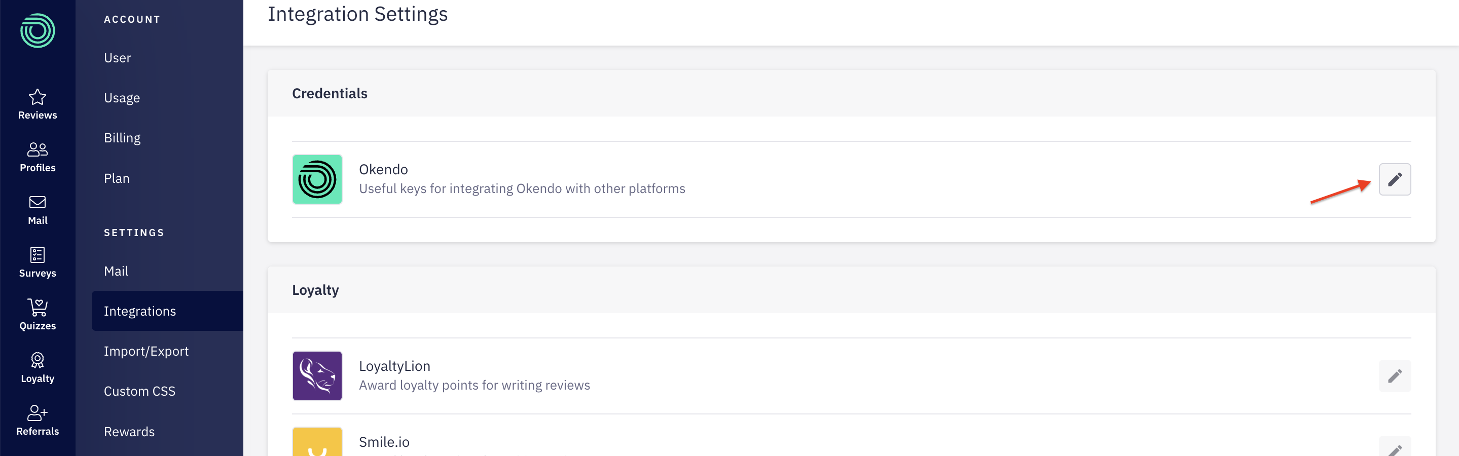 Step 4 - Click on Okendo tile and click the pencil/edit icon.