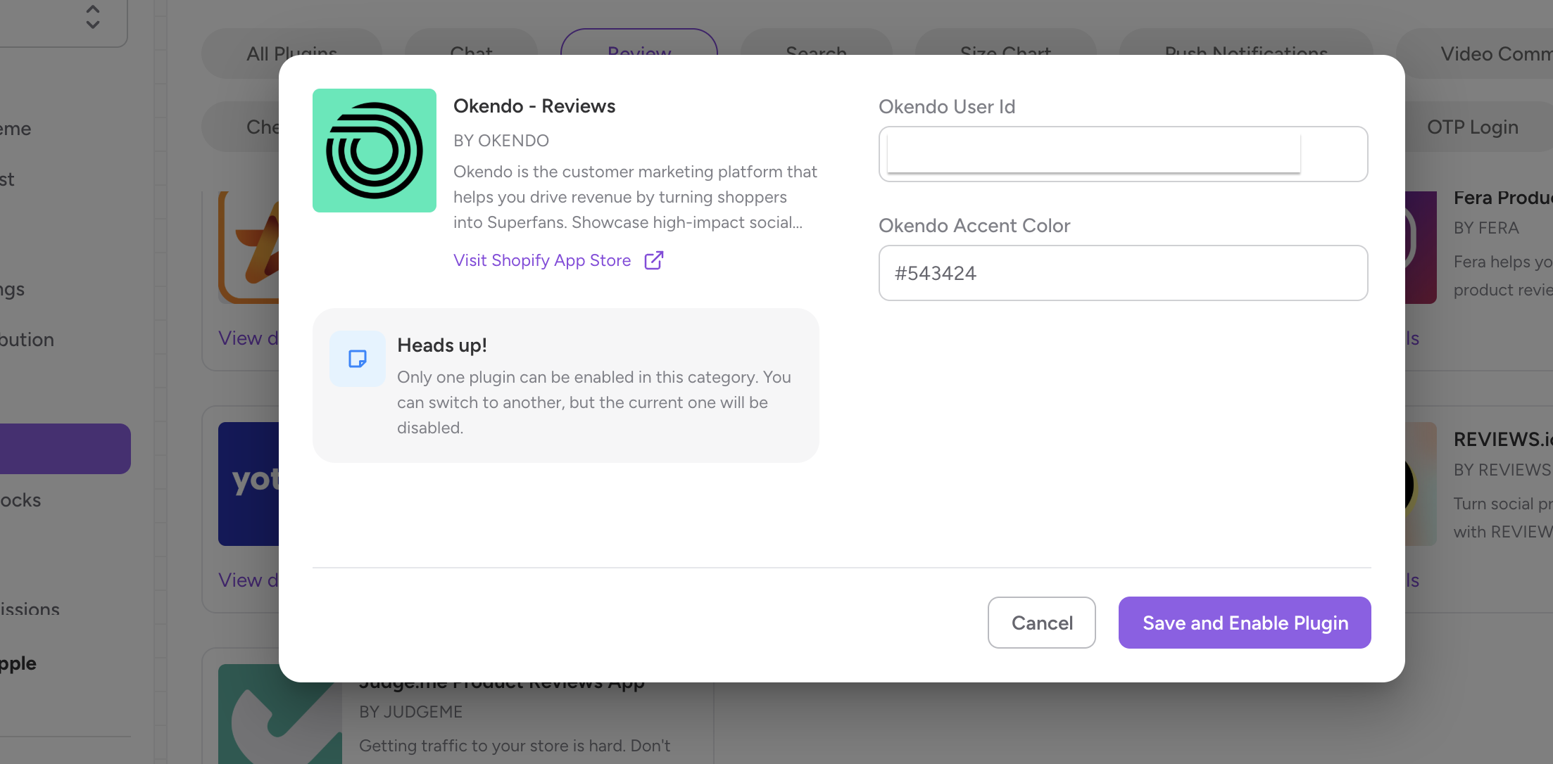 Step 3 - Toggle the button appearing on the right bottom of the plugin card, provide the Okendo User ID from Step 5 of section “Steps to get the Okendo User ID” , provide the colour your brand and click on Save.