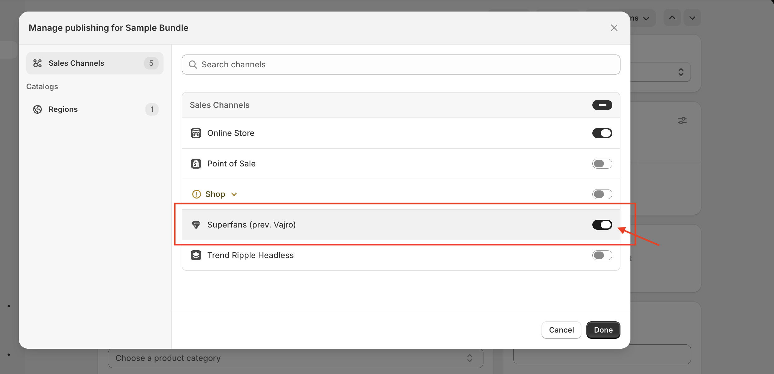 In the Publishing section, click … > Manage sales channels and select the Superfans sales channel.