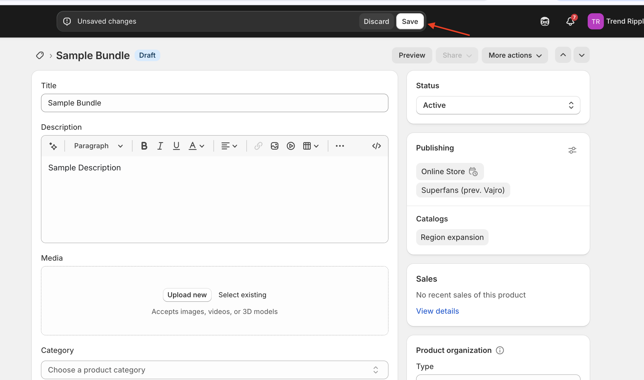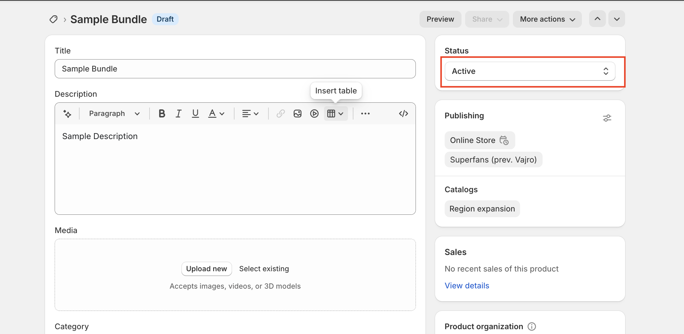 In the Status section, select Active from the drop-down to update the product status.