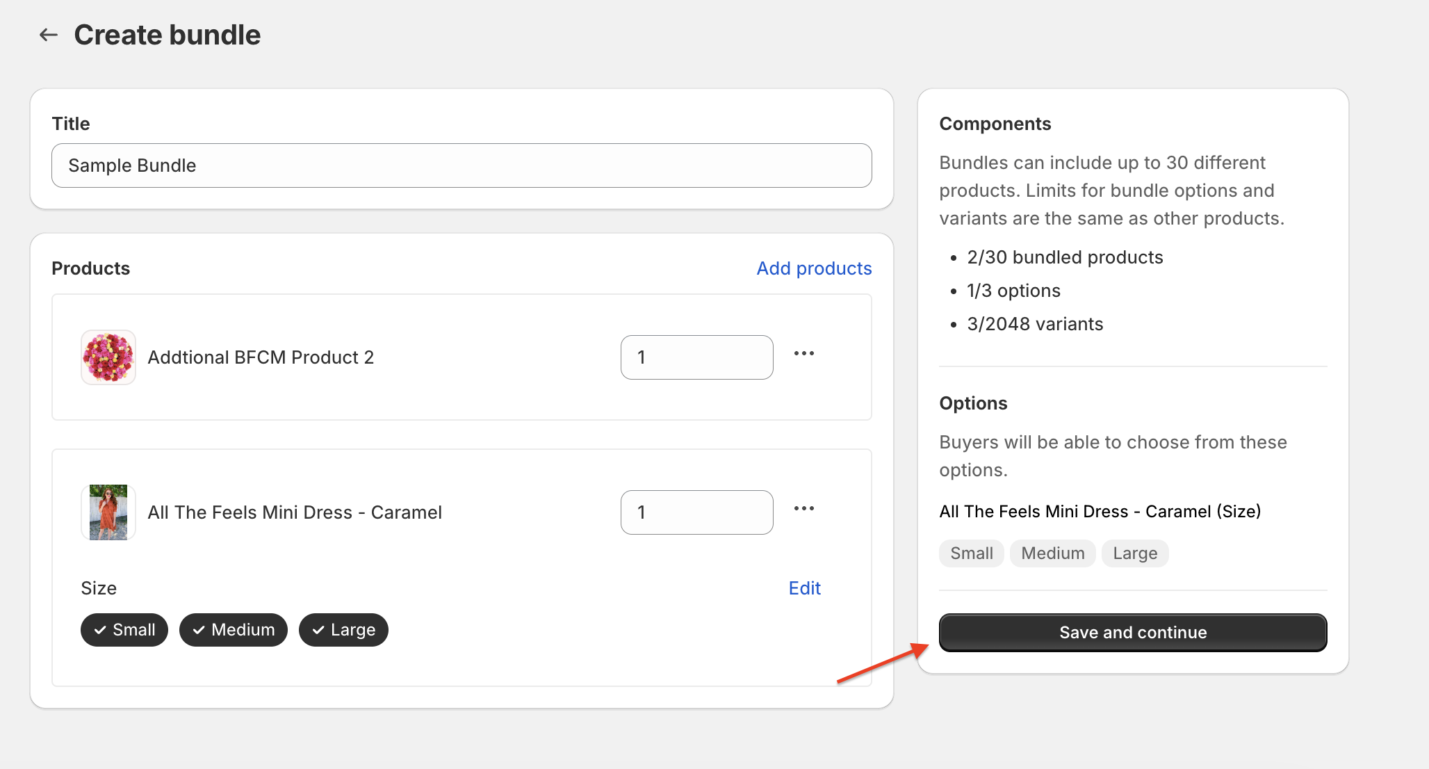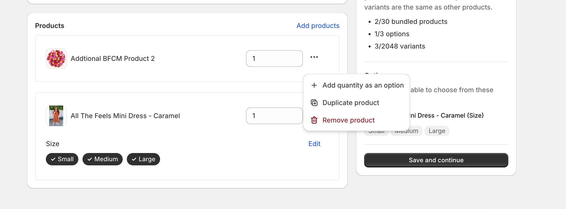 To add the quantity as a bundle option, click … next to the product, and then select Add quantity as an option.