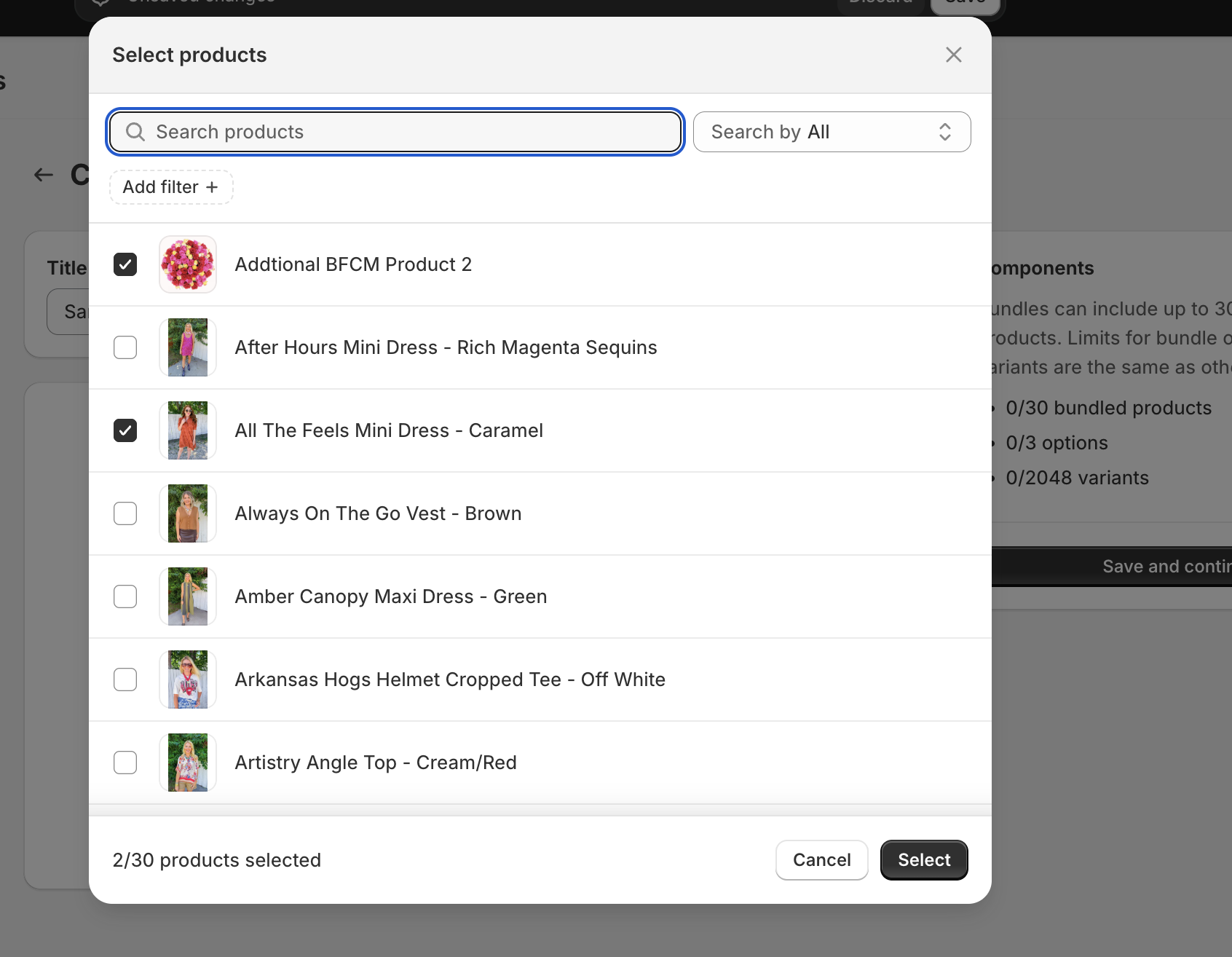 Step 5 : In the Add products dialog, select the products that you want to include in your bundle, and then click Select.