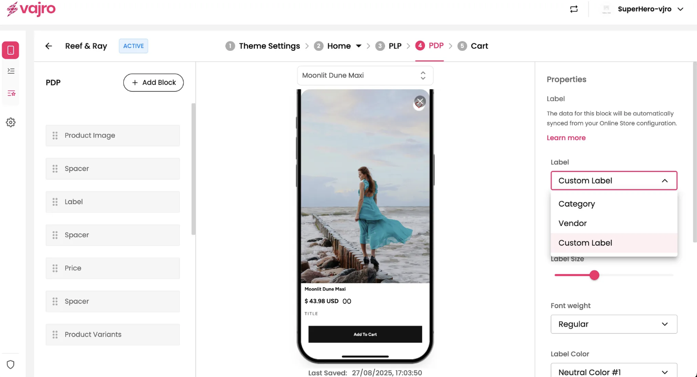 The Label block is a customizable text tag that can be used to display key product information like the category, vendor, or a custom tag. This block helps to quickly inform customers and highlight important product details on the PDP.