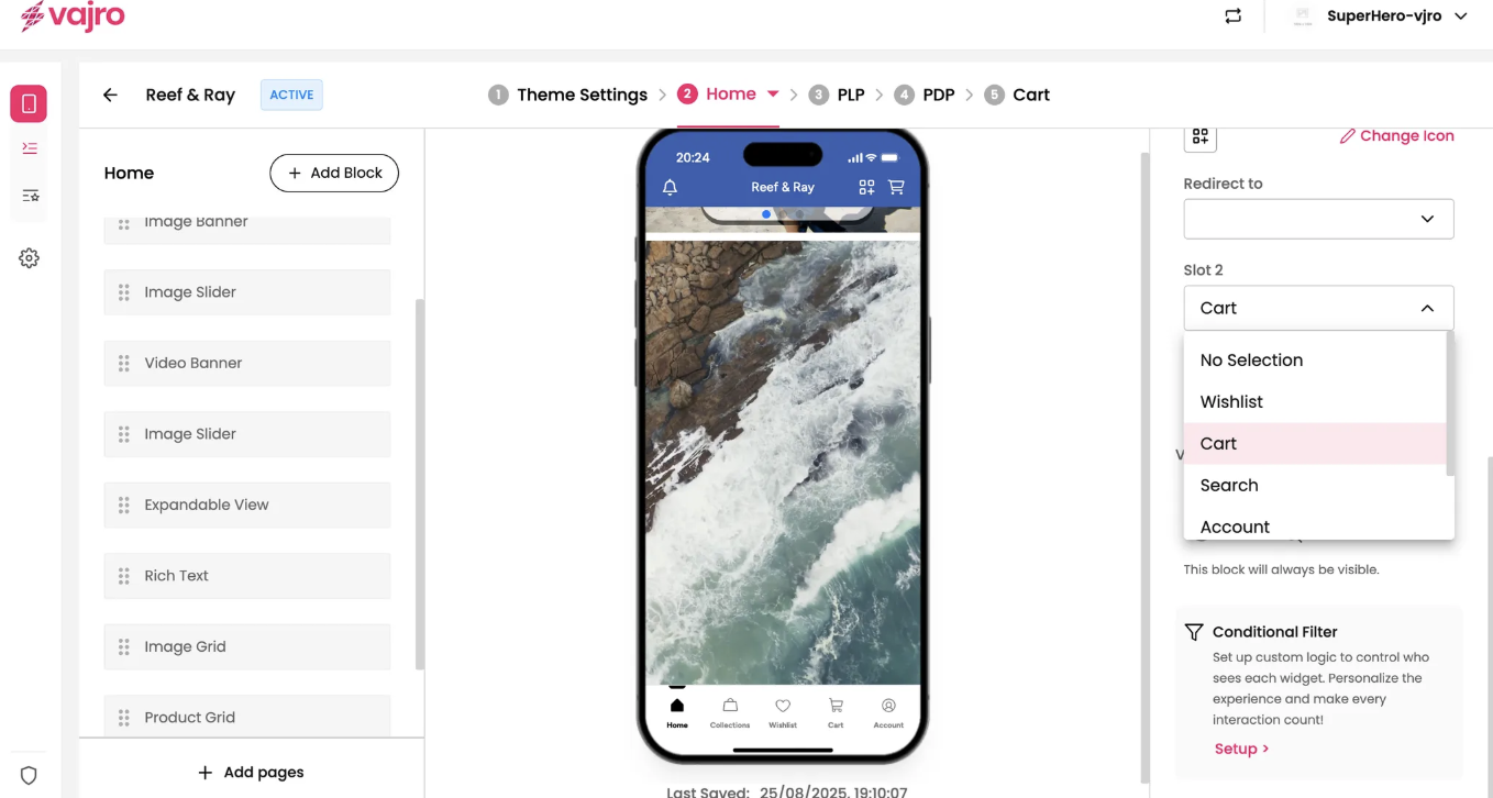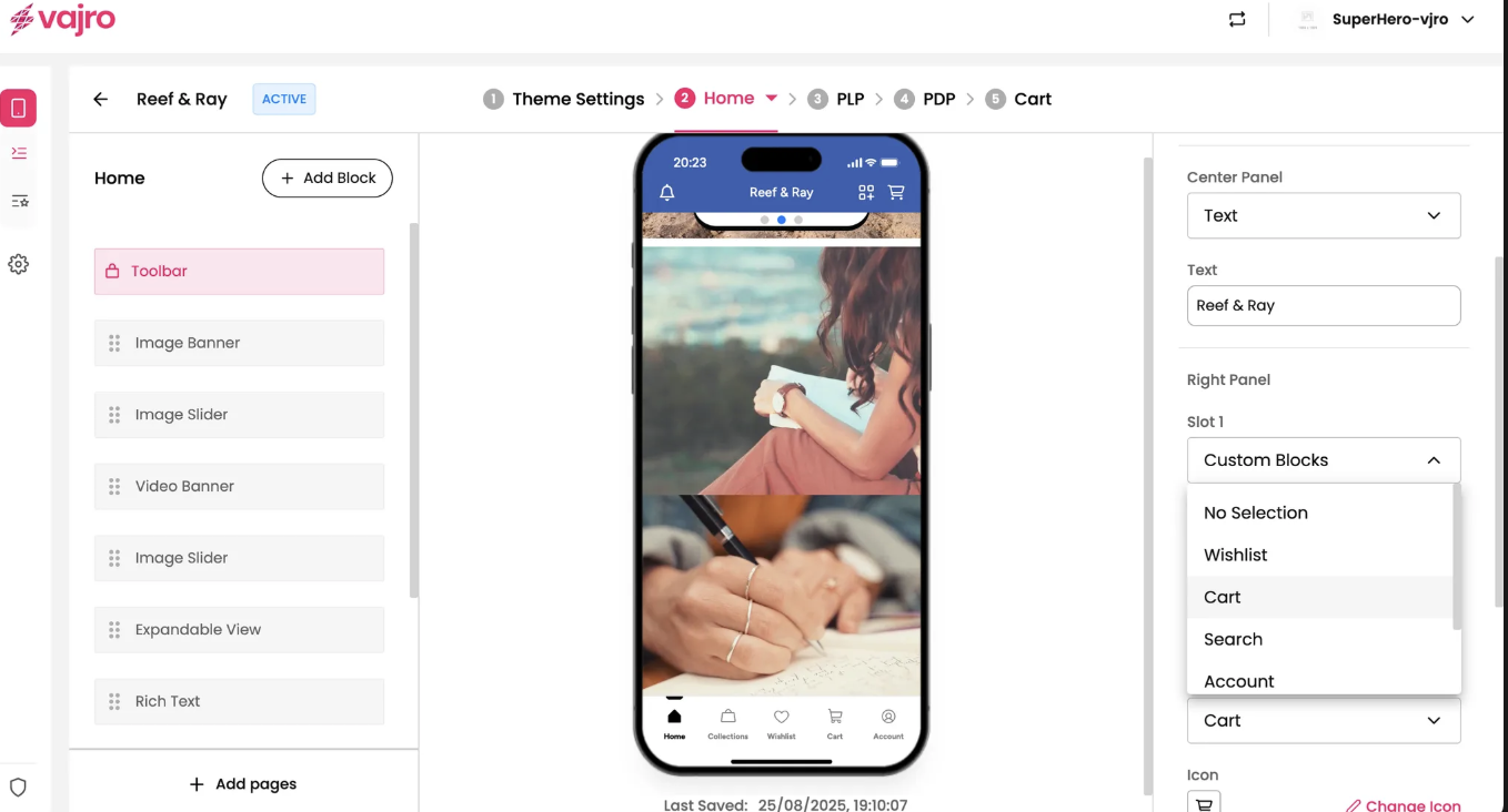 Slot 2: Allows you to select an additional feature for the far right of your toolbar, with the same options: No Selection, Wishlist, Cart, Search, Account, Side Navigation, Notifications, or Custom Blocks.