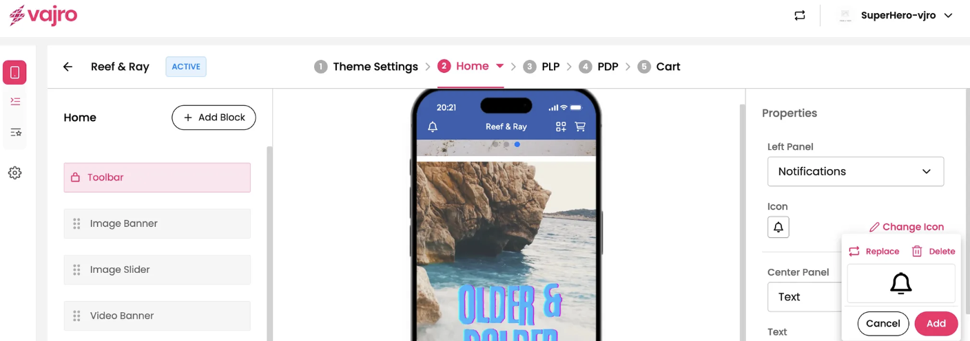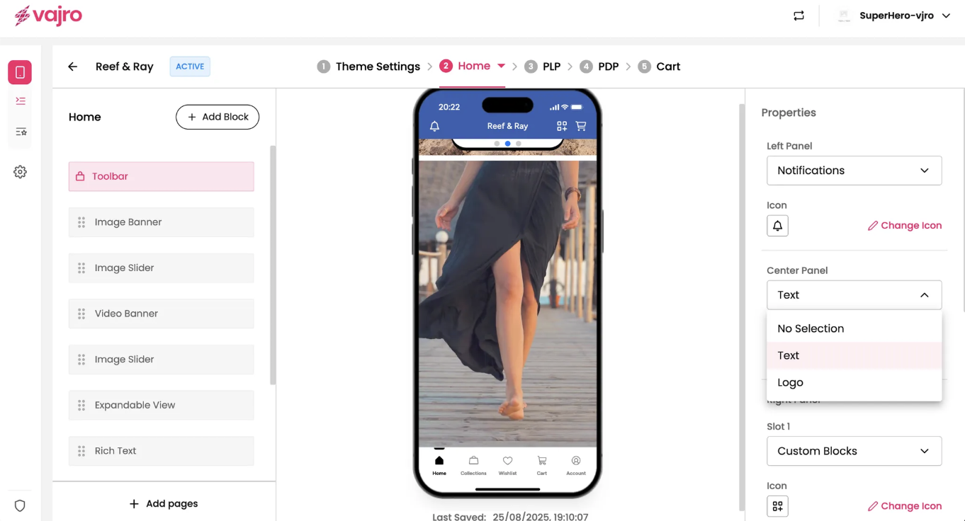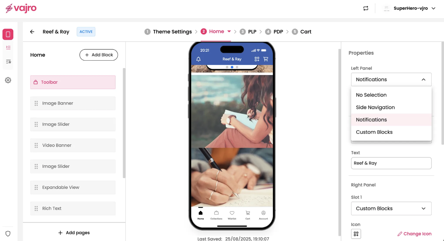 Left Panel: This dropdown controls the icon on the left side of your toolbar. Choose from No Selection, Side Navigation (opens your side menu), Notifications, or Custom Blocks.