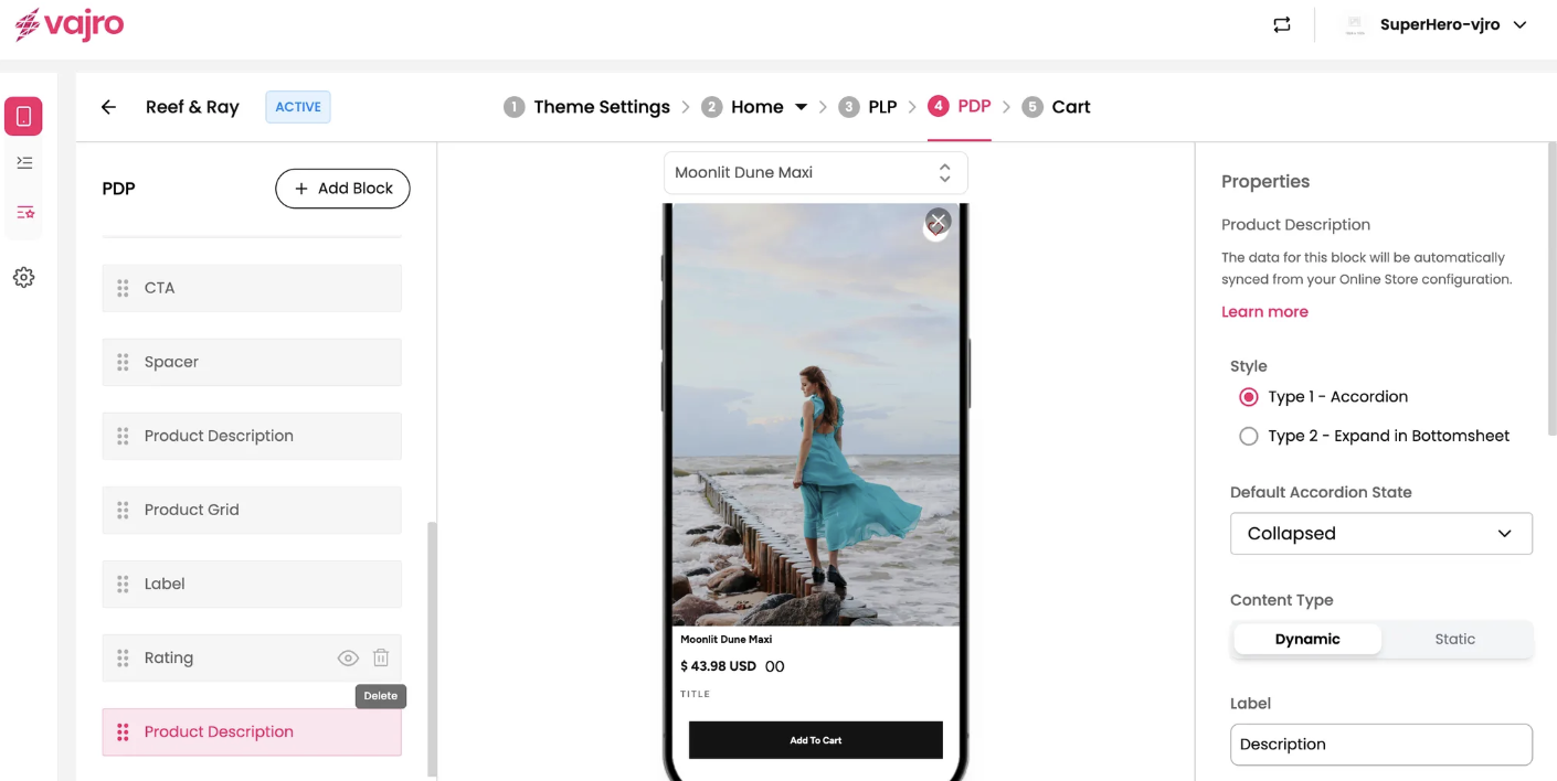 The properties panel for the Product Description block allows you to customize its style, content, and appearance on the page.