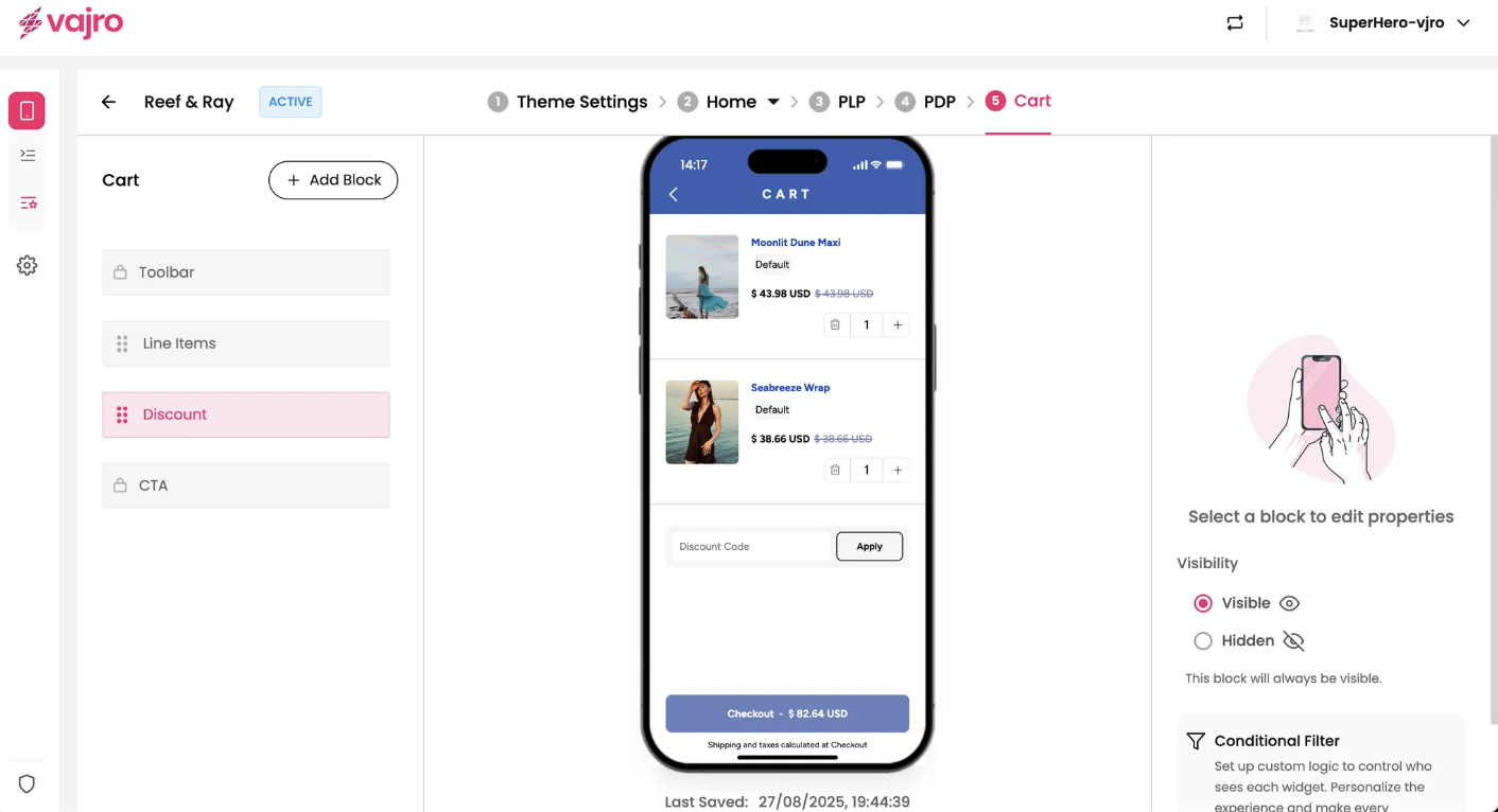 The properties panel for the Discount block allows you to manage the discount input field.