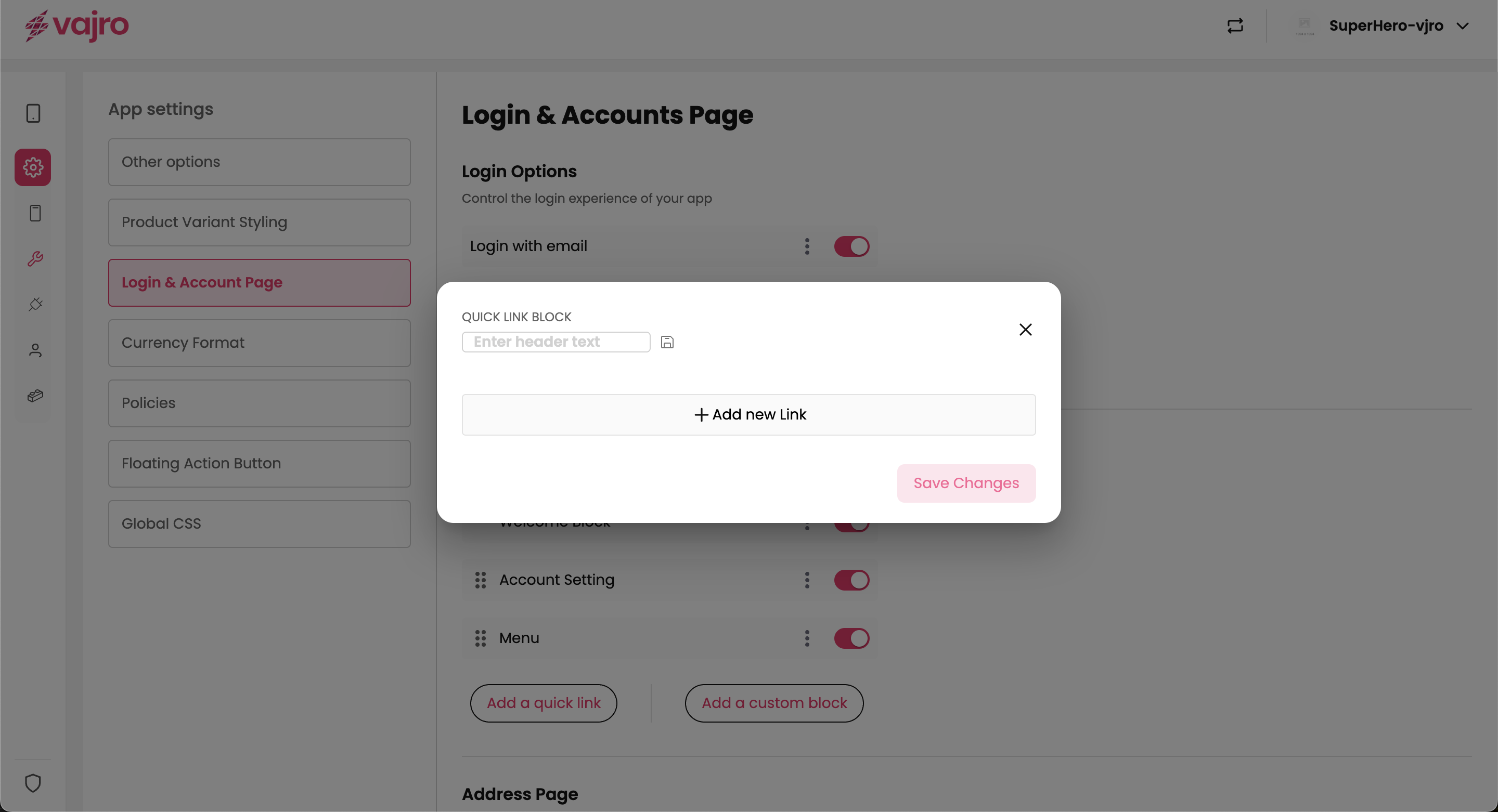 From the Login & Account Page settings, you have the option to add two types of custom content blocks: Quick Link Block and Custom Block.