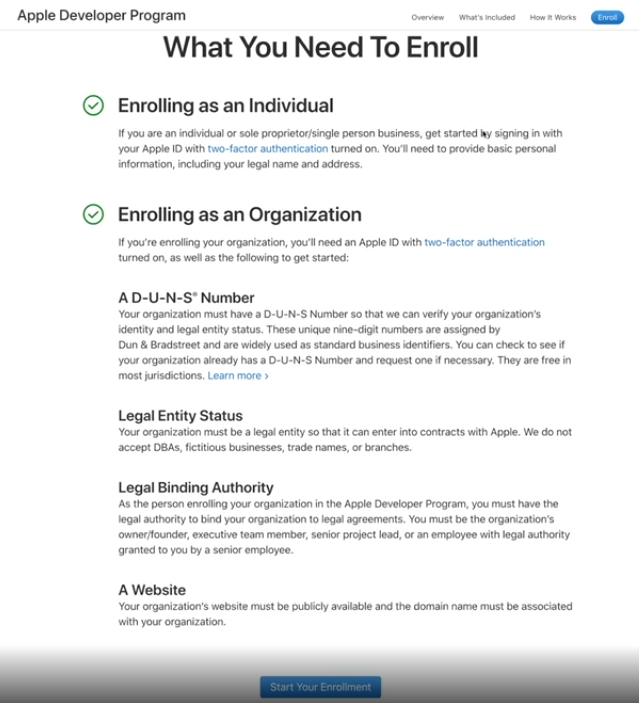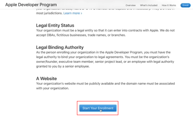 Step 5: You'll now see instructions and guidelines for enrolling in the developer program. Scroll down and click on Start your Enrollment.