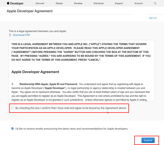Step 2: You'll be redirected to the Terms and Conditions page. Click on the checkbox under the terms and conditions, and click on Submit.