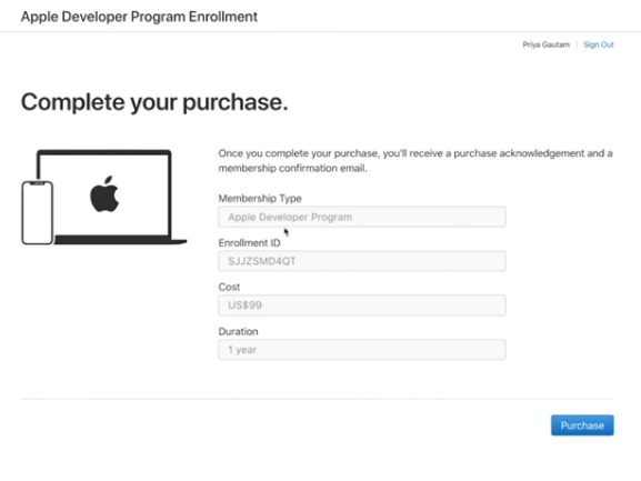 You'll get redirected to a confirmation page, and then an email containing your enrollment ID. Watch out for a verification phone call as well from Apple.