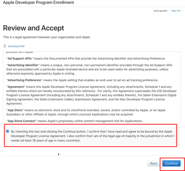 Step 11 : Confirm your authority to create the developer account on behalf of your organization and click on Continue.