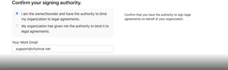 You must be the organization’s owner/founder, executive team member, senior project lead, or an employee with the legal authority granted to you by a senior employee.