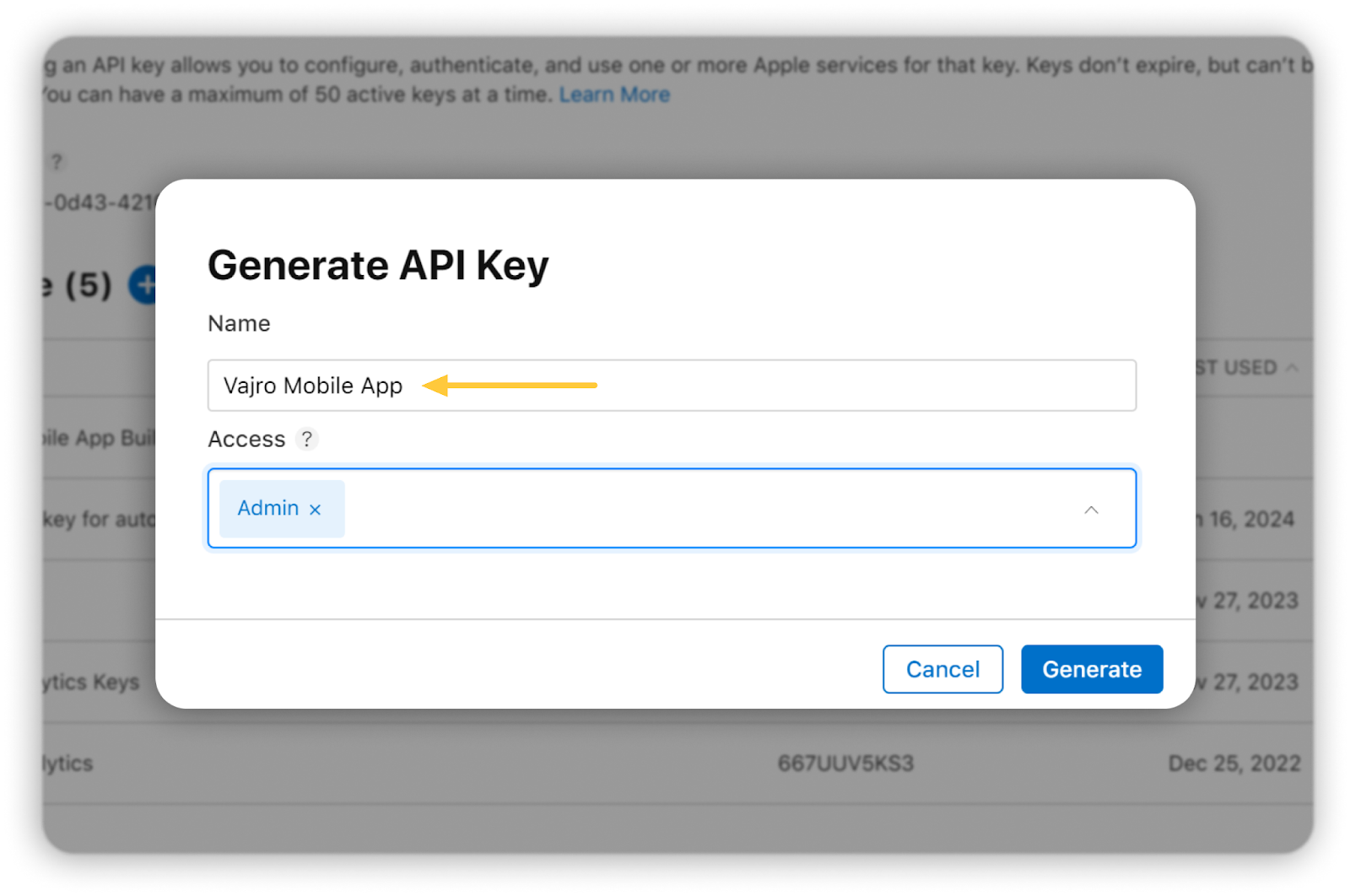 Step 7: Enter Vajro Mobile App under Name, and select Admin under Access. Once you’re done, click Generate.