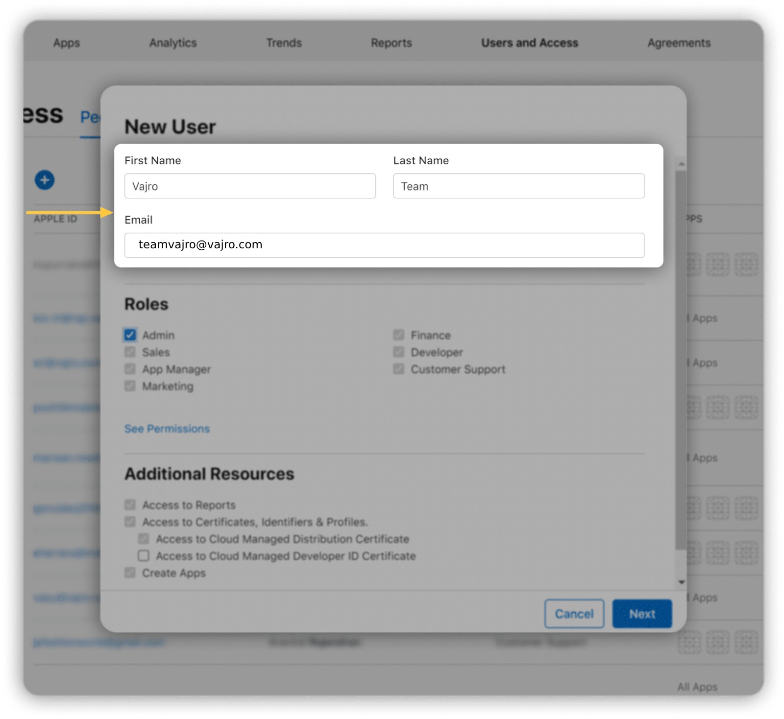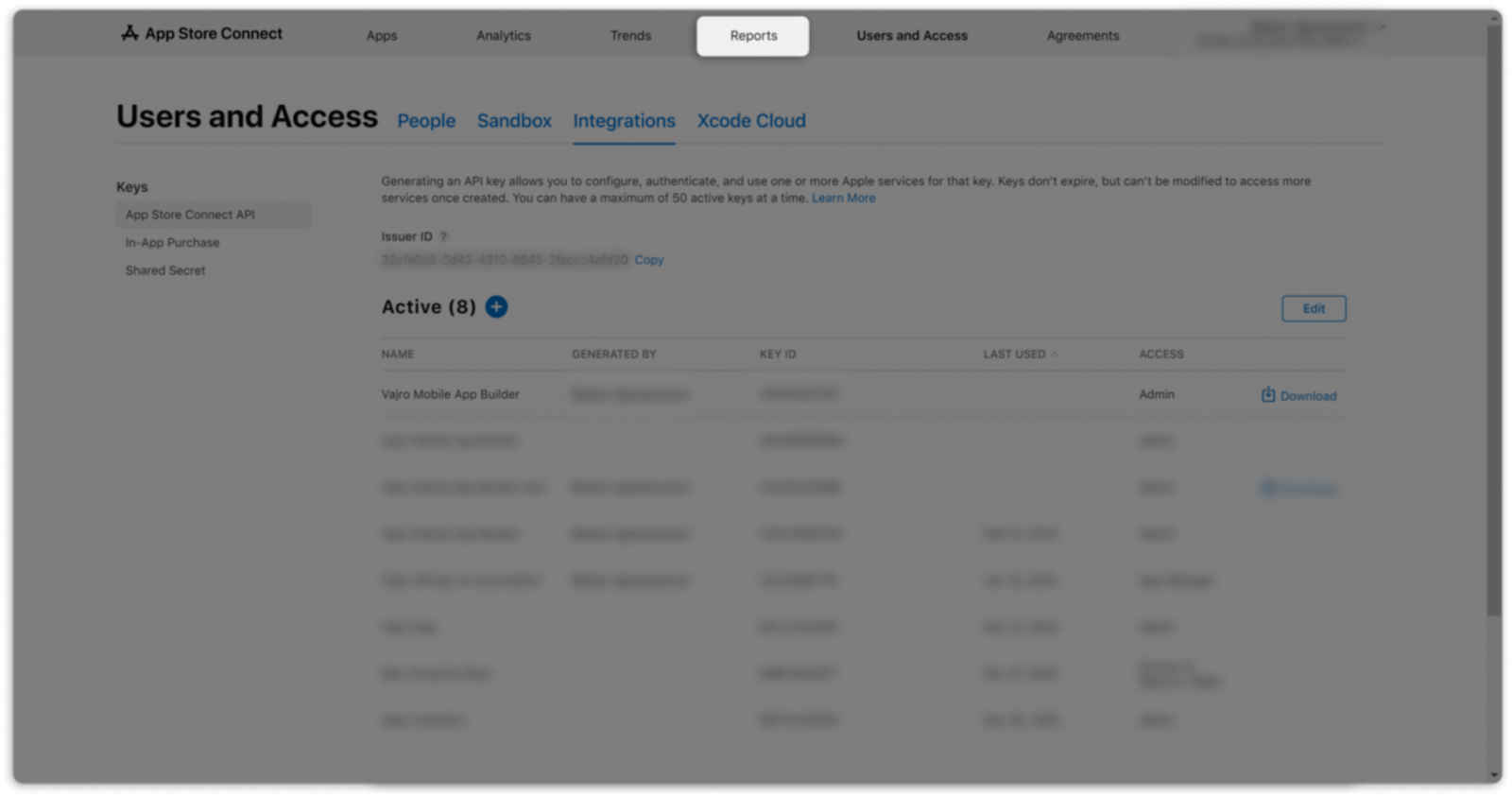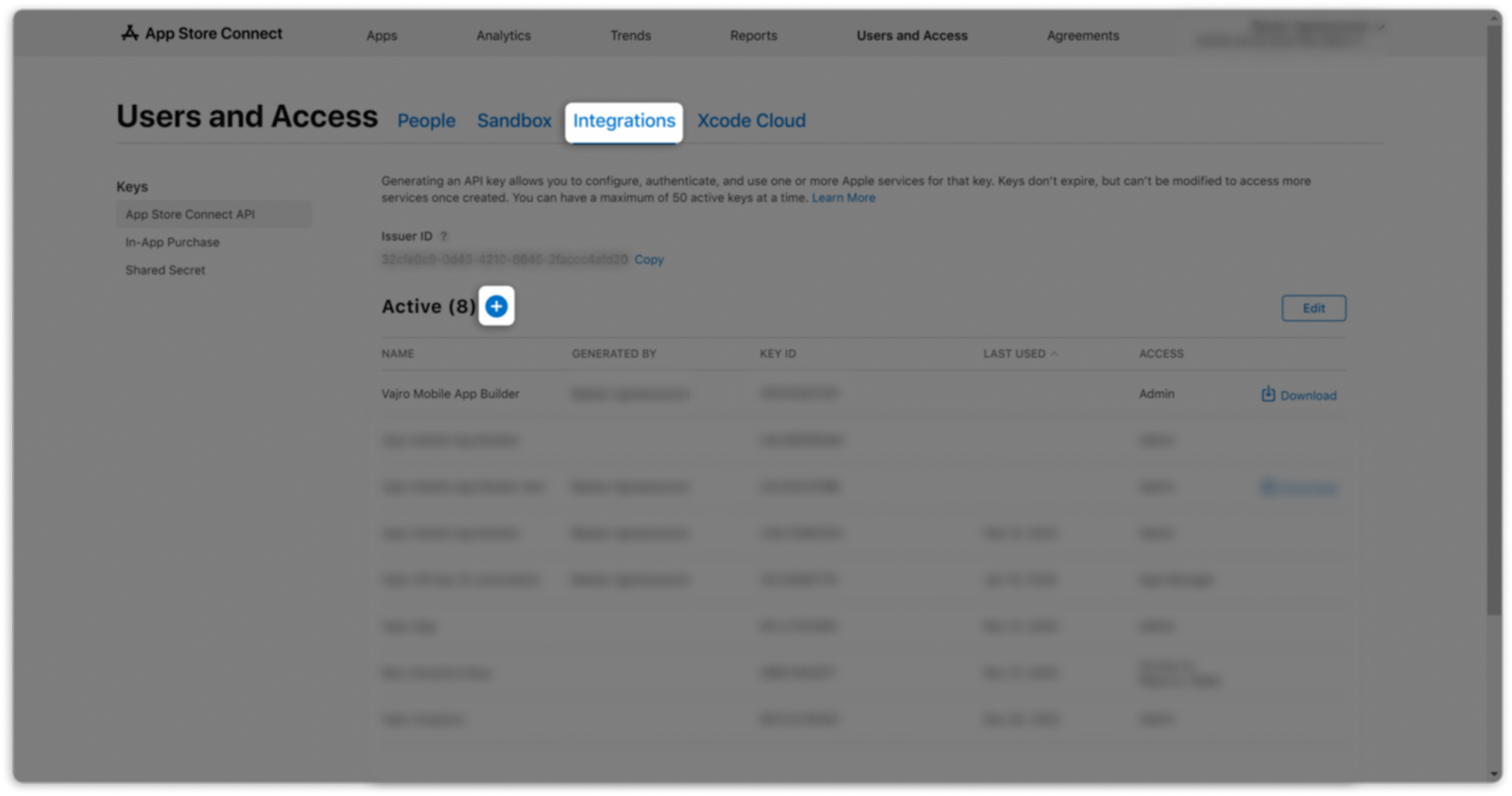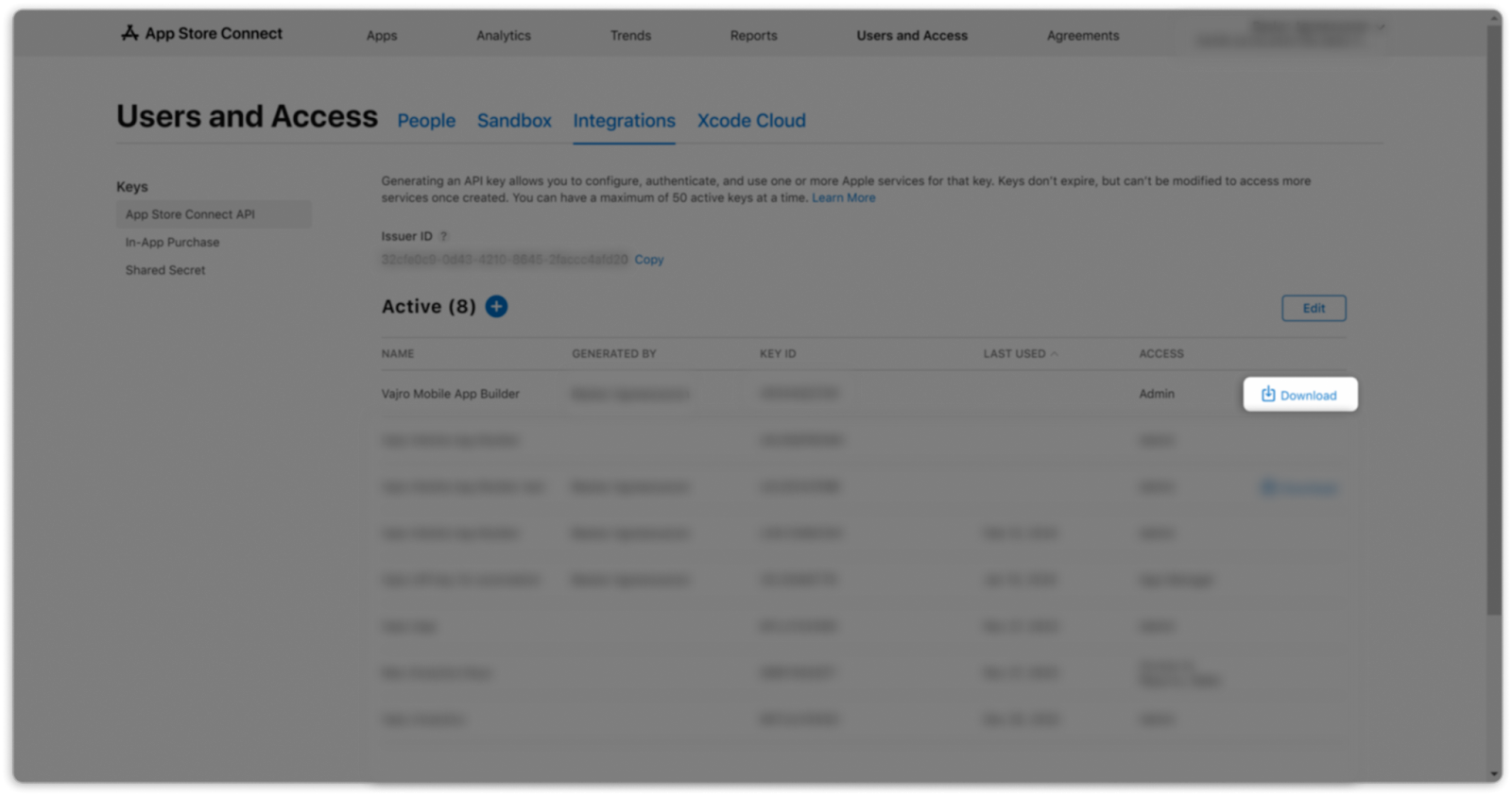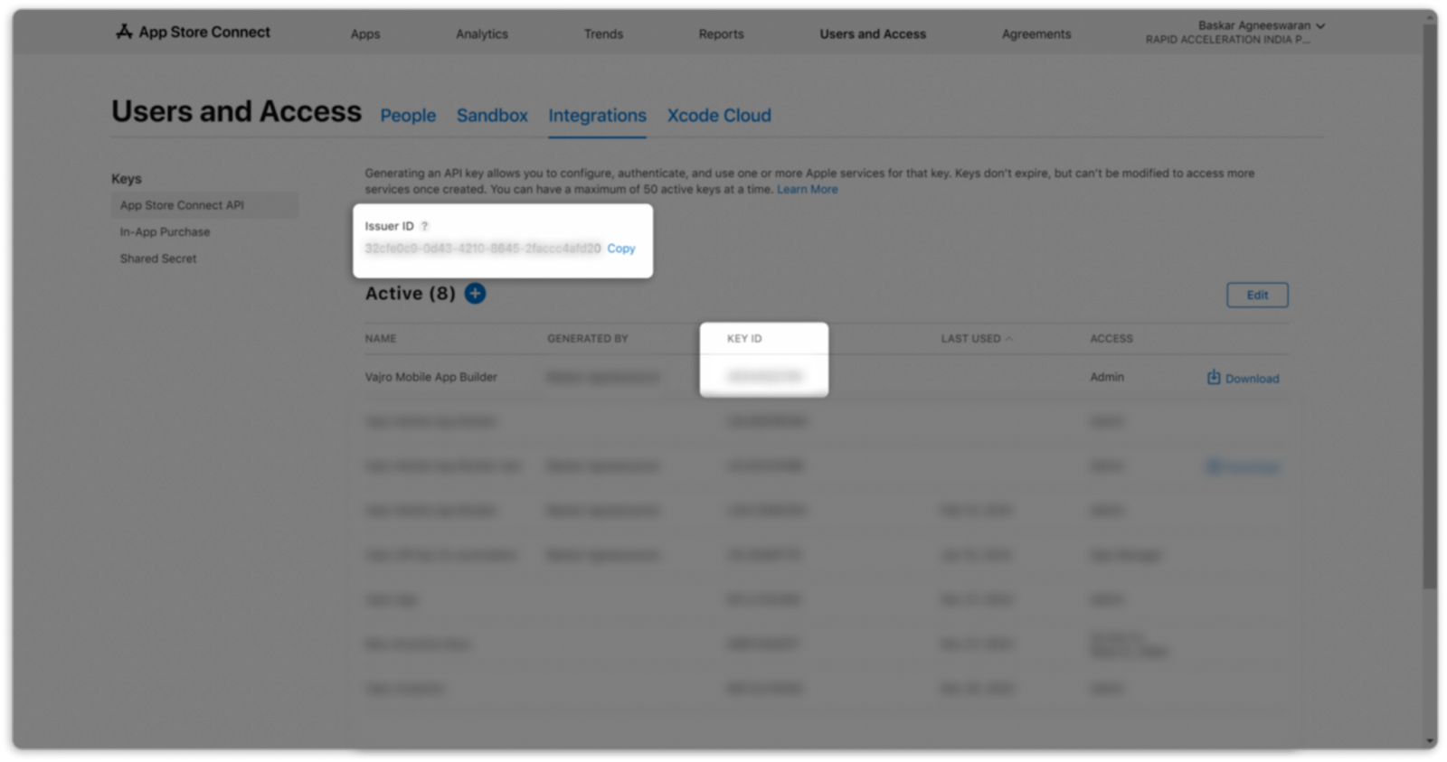 Step 8: Once the API Key is generated, Copy the Issuer ID And the Key ID as you will need to share this with Vajro.