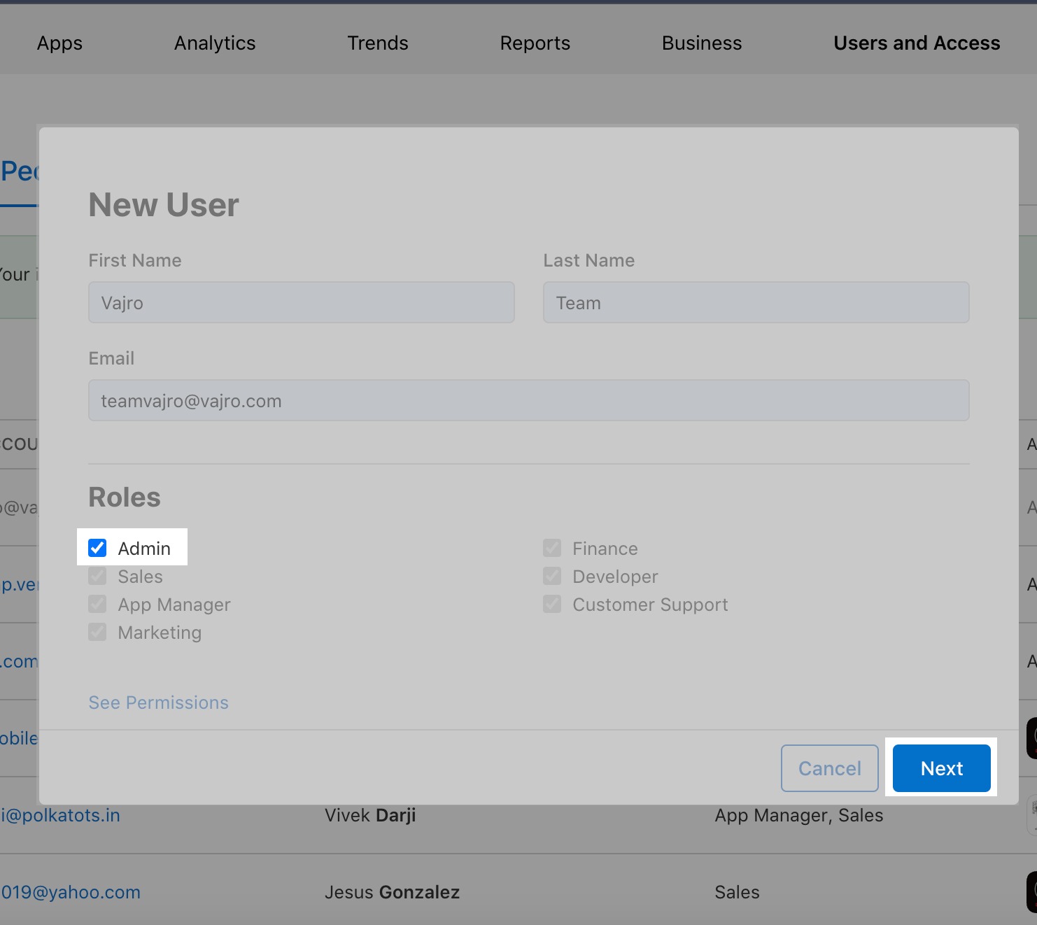 Step 5: Select Admin under the Roles section and click Next to complete the process.