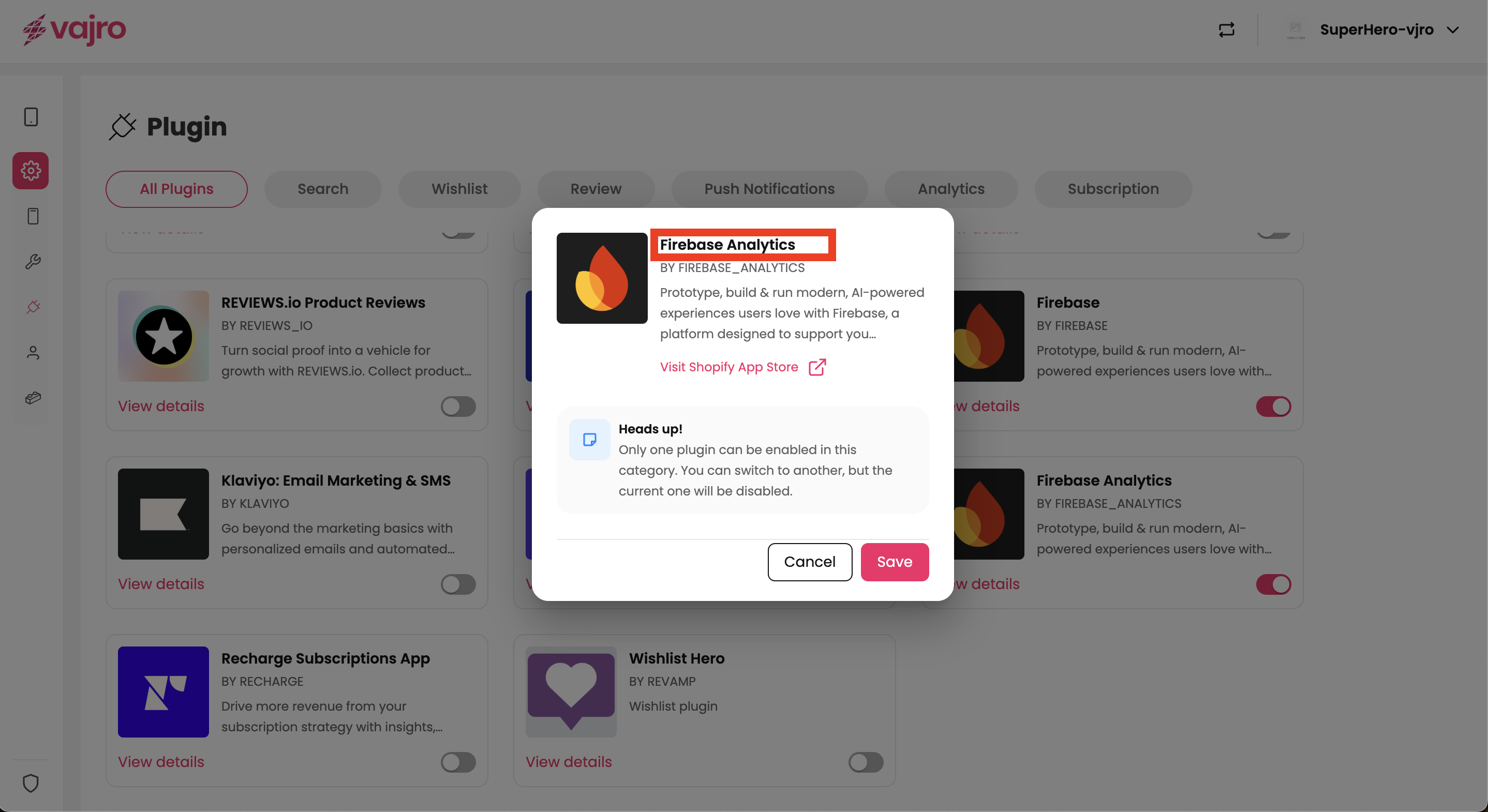 Step 2 : Under the Search category, select Firebase Analytics and toggle it on, click on Save.