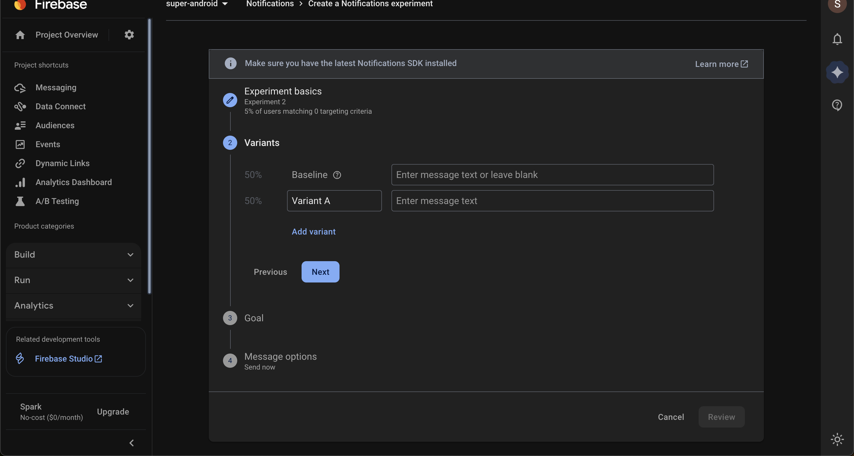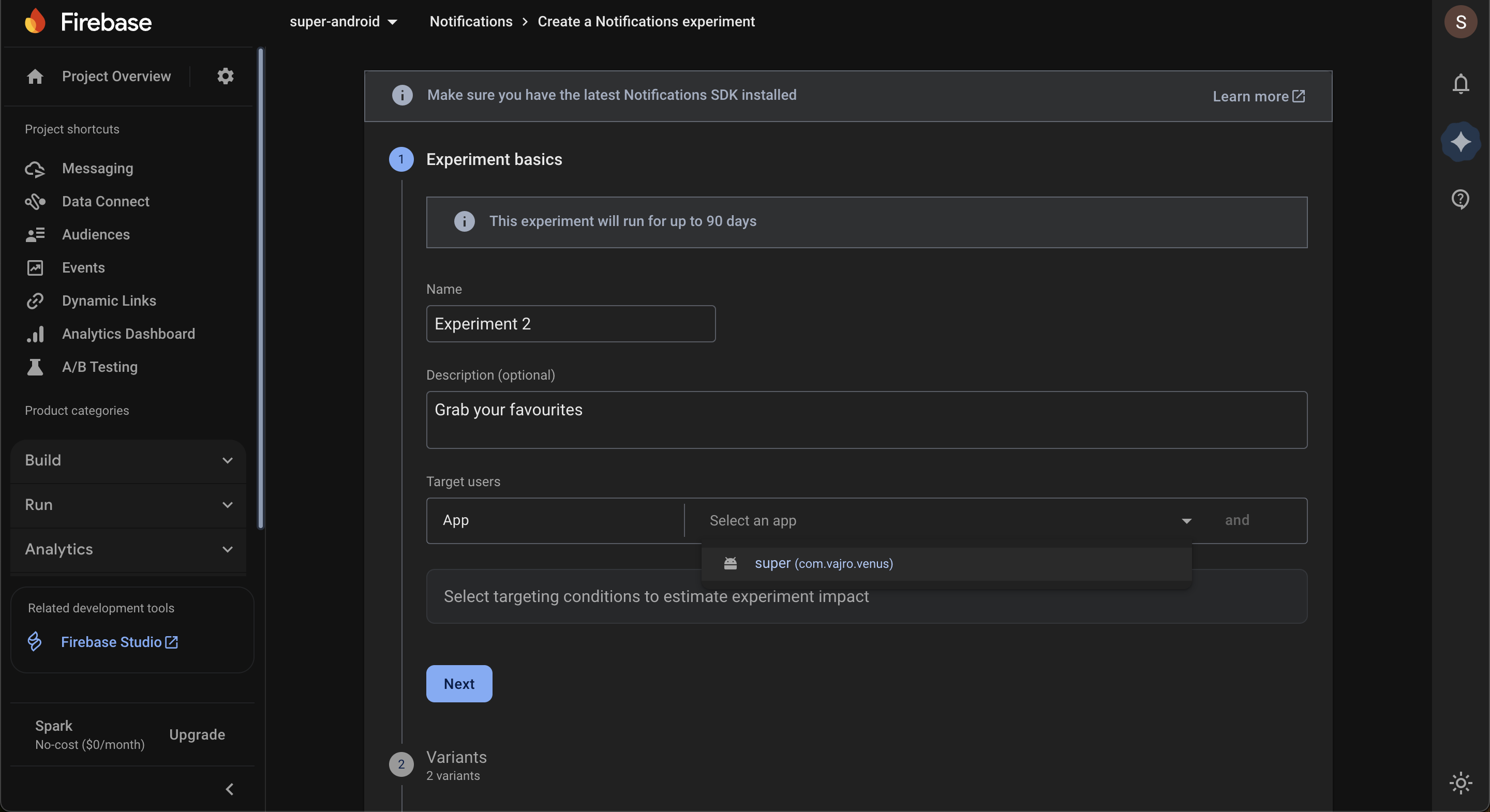 Percentage of Users: Decide what portion of your app users will participate (0.01% -100%). Firebase randomly assigns users to baseline and variant groups. Click Next.