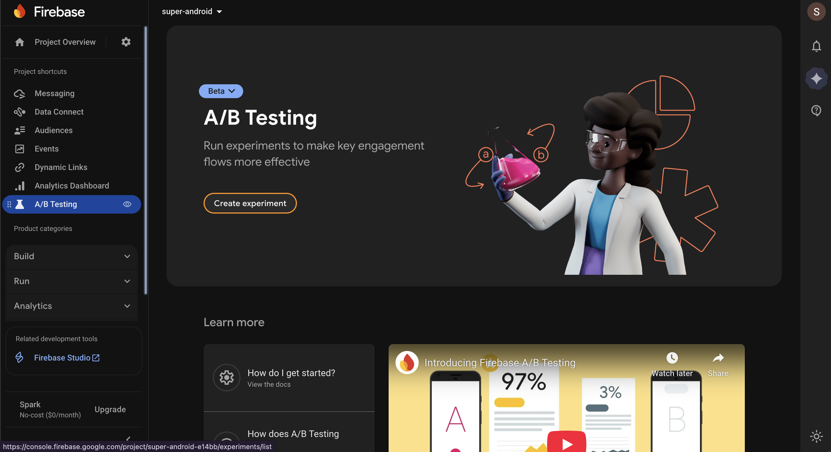 Open the Firebase Console → Engage → A/B Testing → Create Experiment.